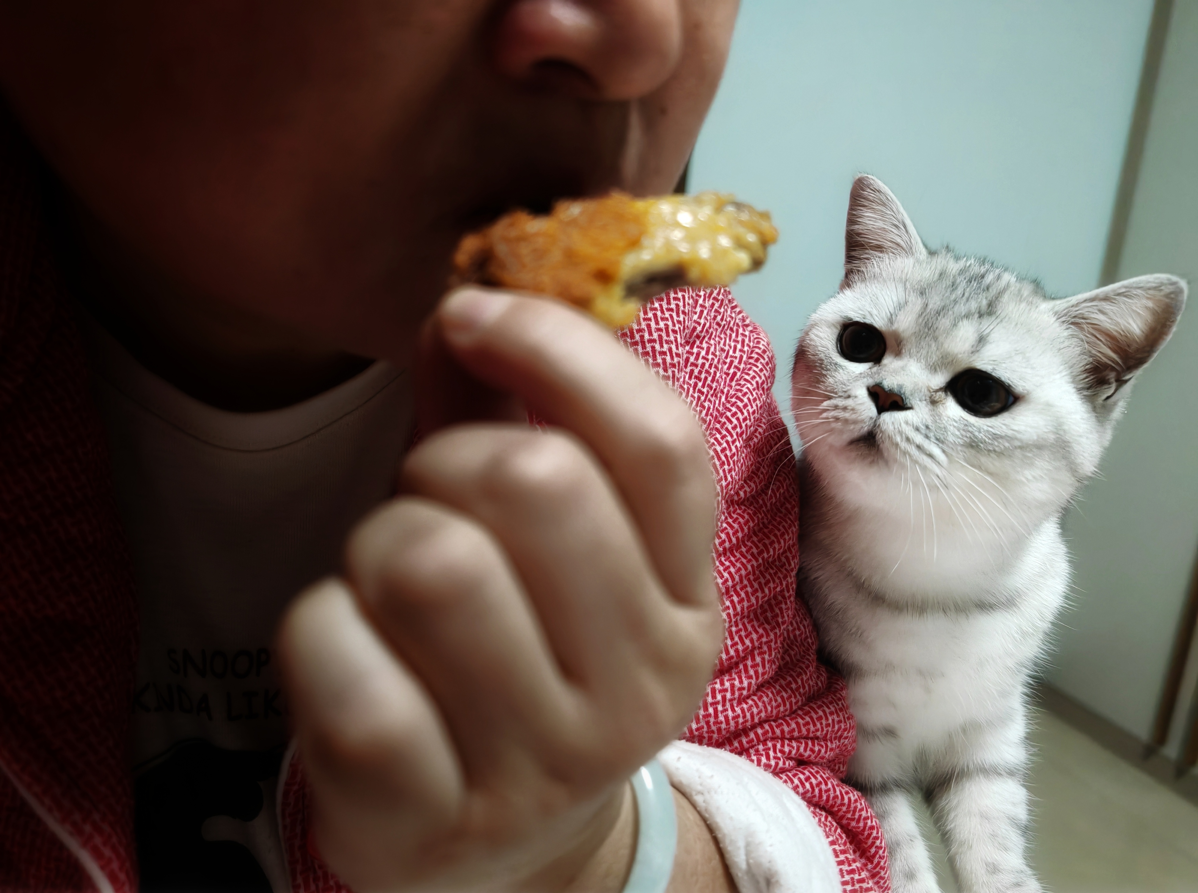 《家有馋猫》毛孩子眼巴巴的看着主人吃食物。