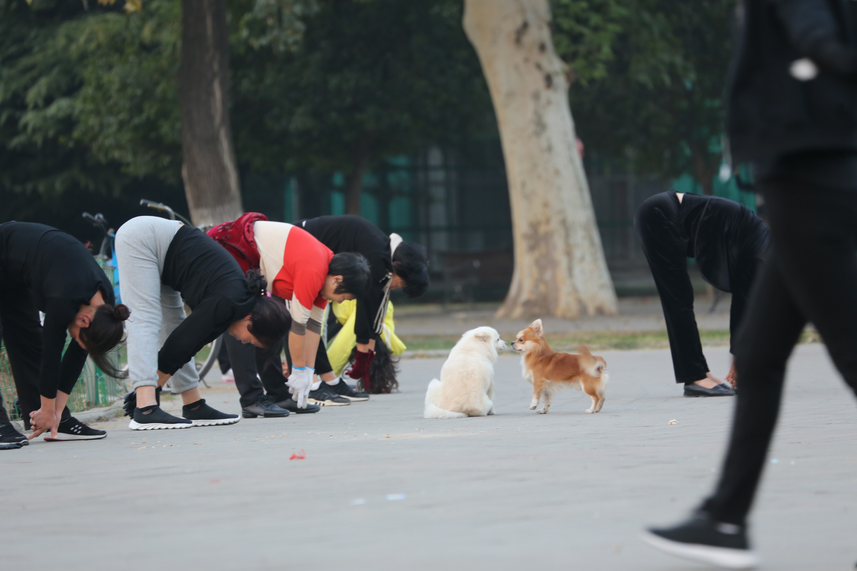 《主人锻炼我聊天》跟着主人去公园锻炼的毛孩子遇到汪星好朋友,互相聊天。