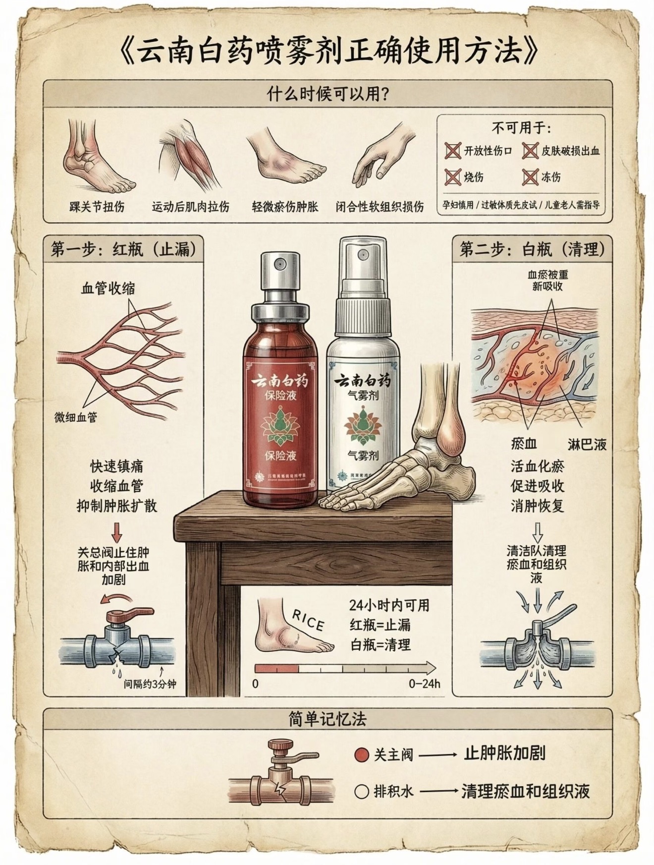 一文搞懂:云南白药红瓶白瓶该怎么用 很多人家中常备云南白药气雾剂,但红瓶、白瓶到底该怎么用?别再乱喷了,看完这篇就懂👇 🎯 一句话核心原则 先红后白,间隔3分钟,顺序千万别搞反! 🤔 什么时候能用? ✅ 适用场景 • 运动后肌肉拉伤、酸胀疼痛 • 关节扭伤,如常见崴脚 • 磕碰、撞击导致的淤青、肿胀 • 皮肤完整的轻度软组织损伤 ❌ 这些情况不能用 • 皮肤破损、出血、有伤口 • 烫伤、冻伤部位 • 任何开放性损伤 ⚠️ 特殊人群注意 • 孕妇不建议使用 • 过敏体质先小范围做皮肤测试 • 儿童、老人需在成人监护下使用 📝 正确使用步骤 Step 1️⃣ 先喷红瓶(保险液) 相当于即时化学冷敷,快速控制伤情 • 作用:迅速镇痛、收缩血管、阻止肿胀加重 • 用法:距皮肤10–15厘米,喷2–3次;剧痛可隔2分钟再喷1次,一天不超过3次。 ⏱️ 等待约3分钟 让红瓶充分干燥、起效,先“止肿、止痛”。 Step 2️⃣ 再喷白瓶(气雾剂) 负责后期修复消肿 • 作用:活血化瘀、消肿止痛、促进淤血吸收 • 用法:距皮肤10–15厘米,喷3–5次,每天3–5次。 ⏰ 急性期(24小时内)能用吗? ✅ 完全可以! 思路和急性损伤RICE原则一致: • 红瓶:先“止漏”,减少出血、肿胀 • 白瓶:再“化瘀”,促进淤血吸收 🧠 超简单记忆法 把扭伤比作水管漏水: • 🔴 红瓶 = 先关总阀门,防止继续“漏水”肿胀 • ⚪ 白瓶 = 再清理积水,加快淤血吸收 只关阀门不清理,恢复慢;只清理不关阀门,越肿越重。先红后白,恢复最快。 📌 特殊情况 轻微磕碰、略肿但不痛: 👉 可直接喷白瓶,可不使用红瓶。 📋 最终总结(划重点) ✔ 先红后白,顺序不能乱 ✔ 两瓶间隔1–3分钟 ✔ 受伤24小时内也能用 ✔ 皮肤破损、有伤口严禁使用 ✔ 按次数使用,不要过量喷洒 💡 温馨提示:若扭伤后疼痛剧烈、明显肿胀、活动受限,请及时就医,不要仅依赖喷雾! #健康生活实用指南#家庭常备药品知识#急性扭伤消肿攻略#云南白药气雾剂详解#运动后肌肉拉伤处理#云南白药使用指南 #扭伤 #崴脚 #消肿 #健康科普