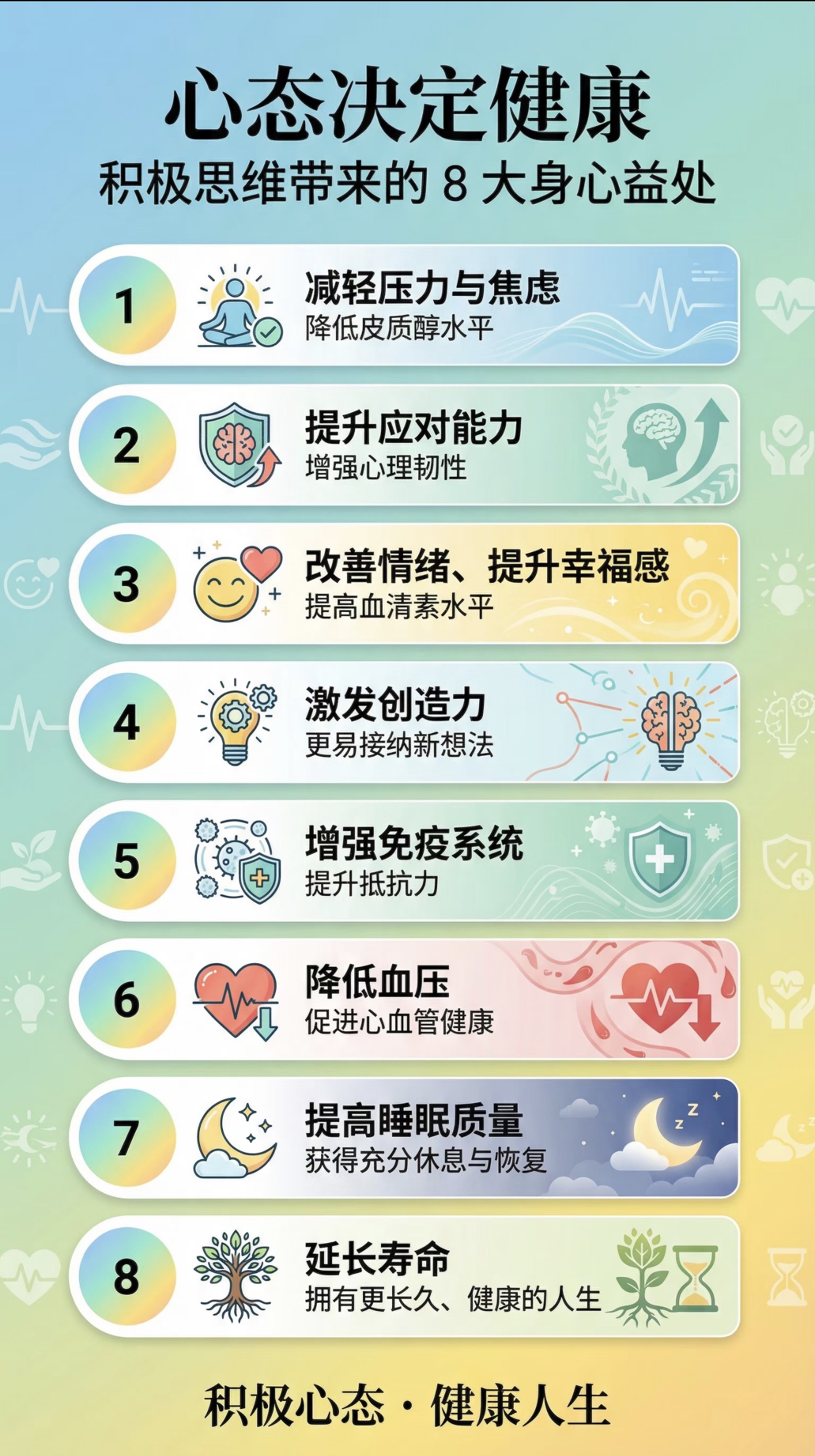 心态决定健康:积极思维带来的8大身心益处 积极思维不只是一种心态,更能从生理与心理上全面受益:减压稳情绪、强免疫、护心脑、助睡眠、增活力,让人更健康、更长寿。#提高睡眠质量#积极心态的力量#心态决定健康