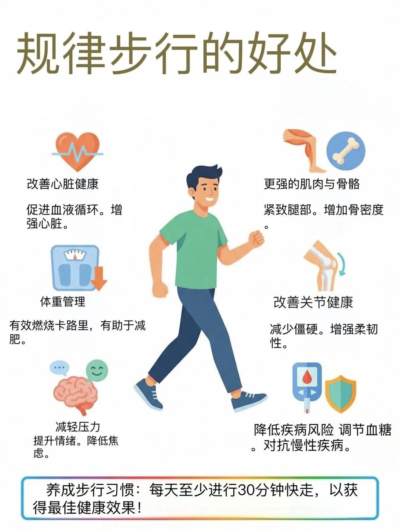 别小看日常散步,它的重要性远超你的想象!☝️ 规律步行能增强心血管系统,降低患心脏病和中风的风险。它通过改善血糖调节来促进新陈代谢健康,并有助于体重管理。在心理方面,步行能释放内啡肽,降低皮质醇水平,从而缓解压力。