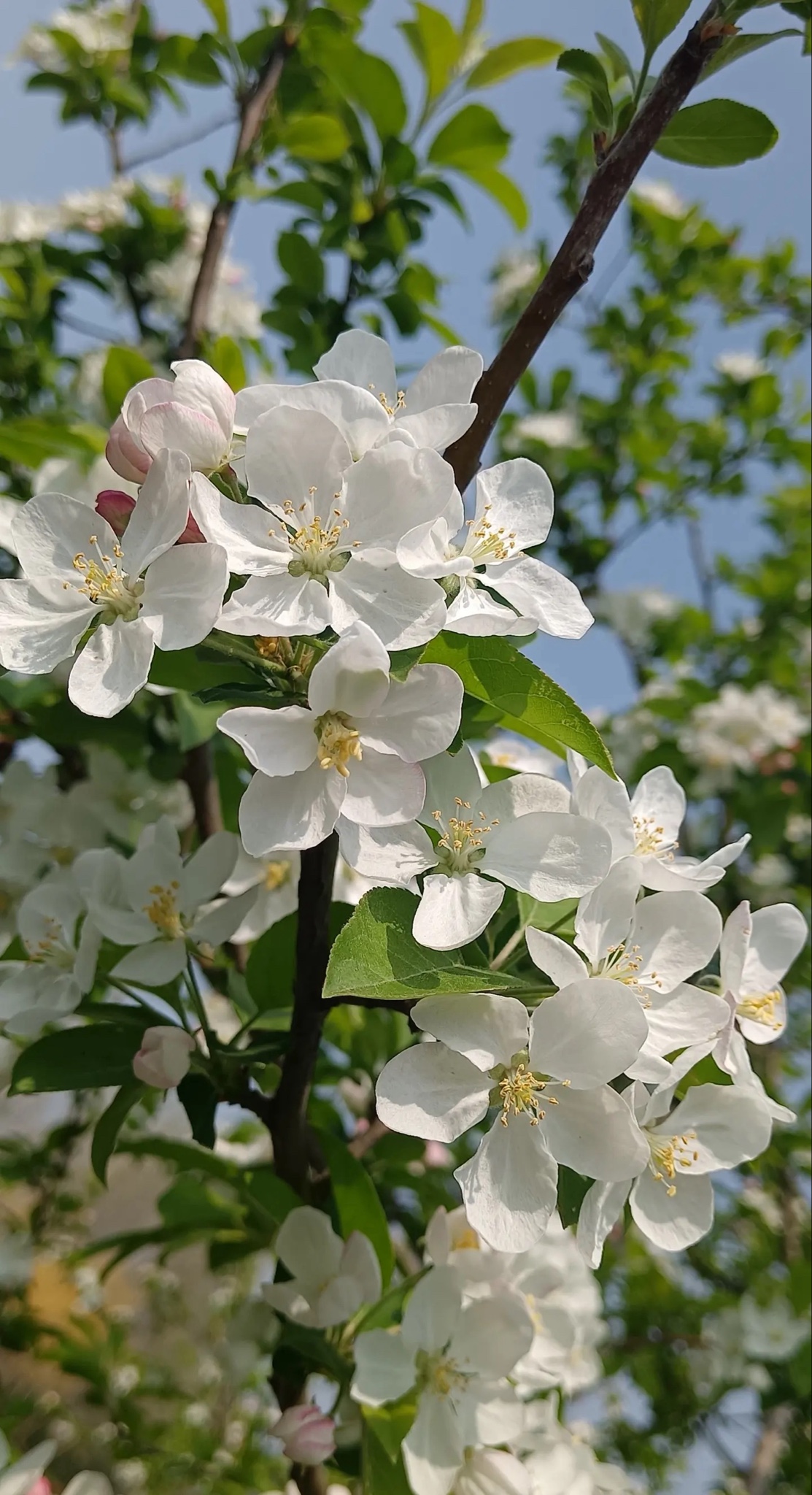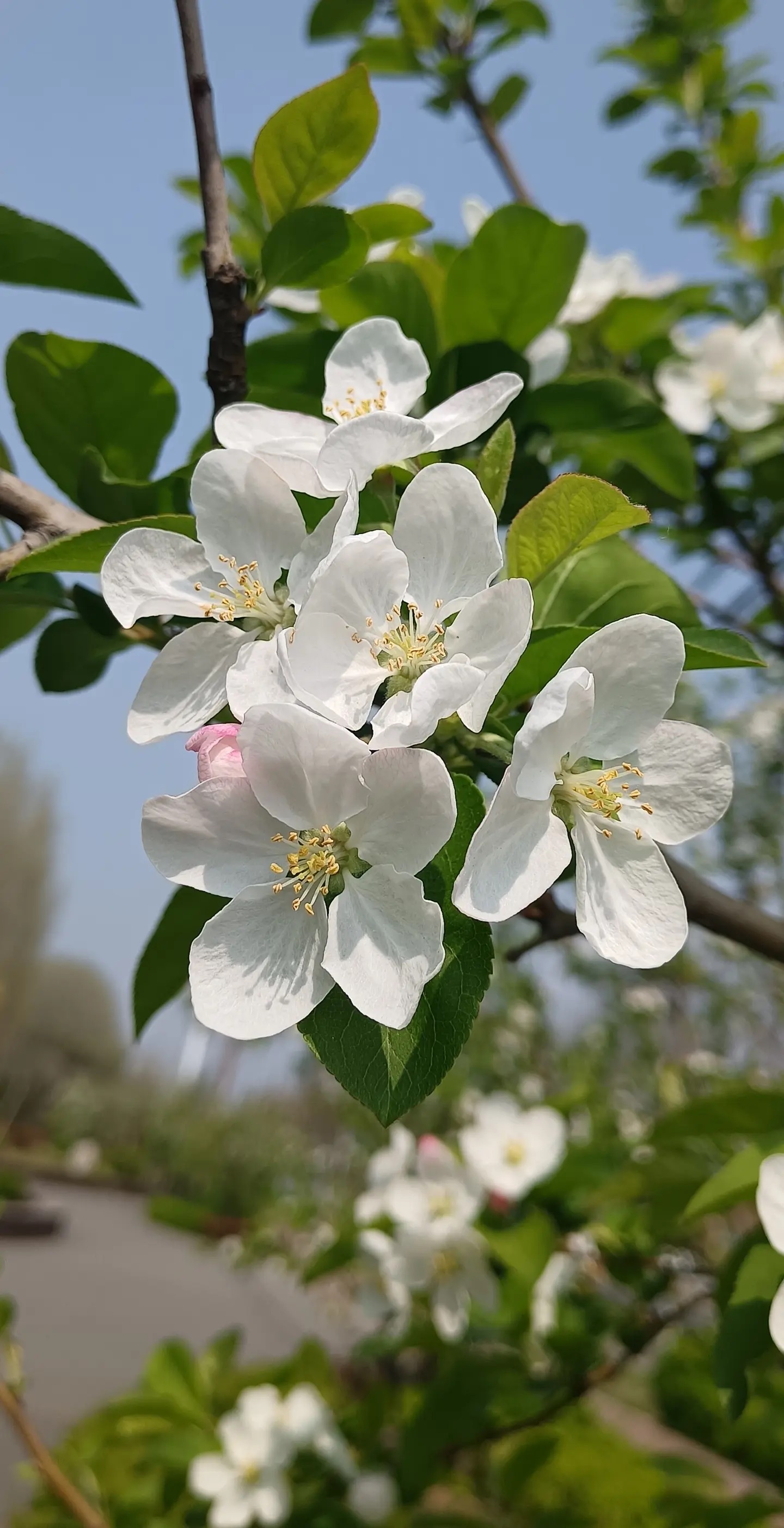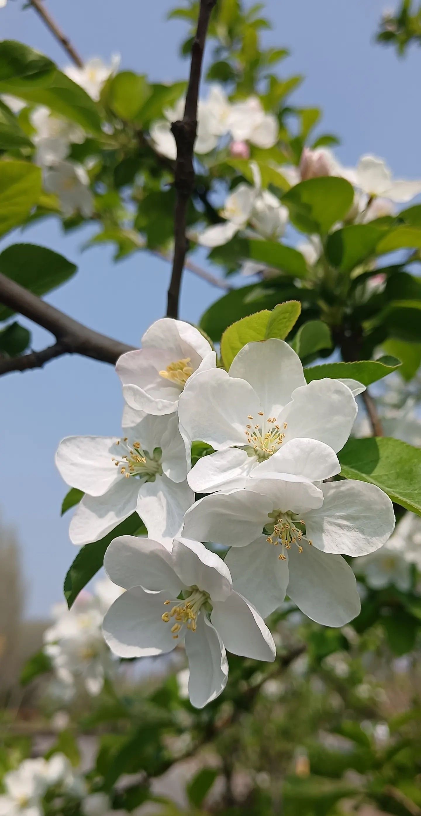 粉白花瓣踮脚攀上枝头,嫩绿新叶在风里轻轻翻页。蓝天是它最澄澈的底片,阳光为每朵花镀上微光。镜头凑近,五瓣玲珑托着金蕊,像春写给秋的第一封情书——未落果时,已藏满甜意。