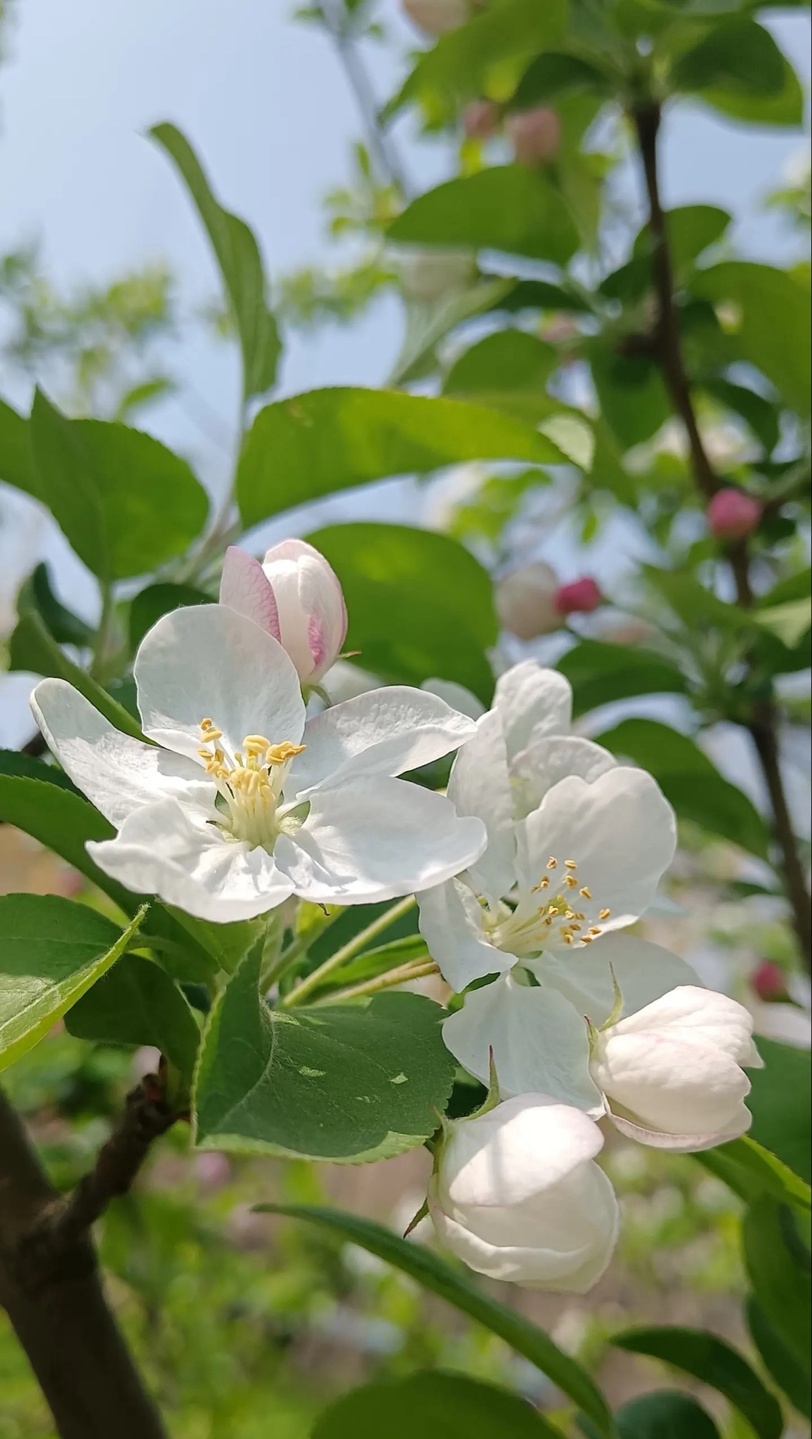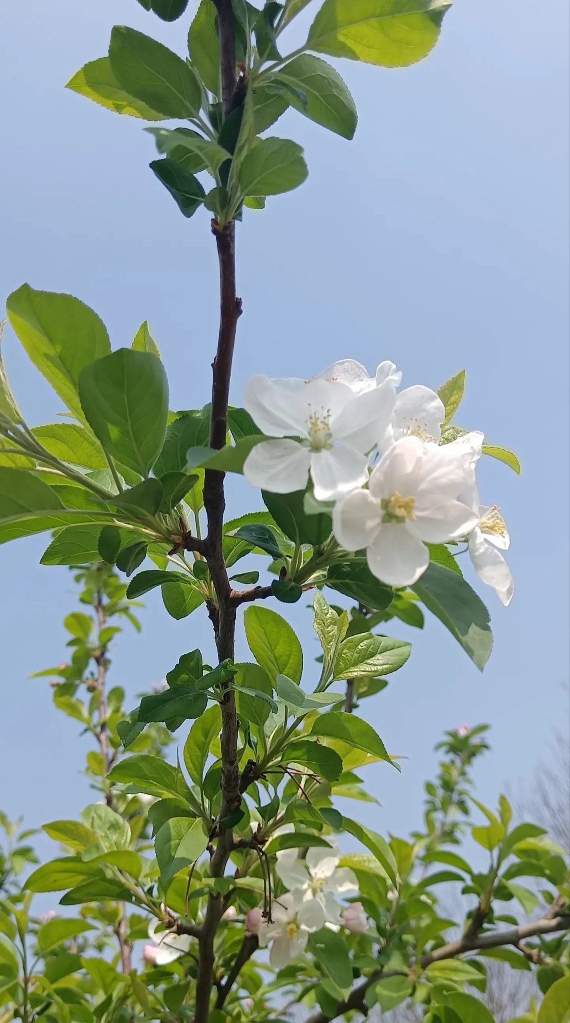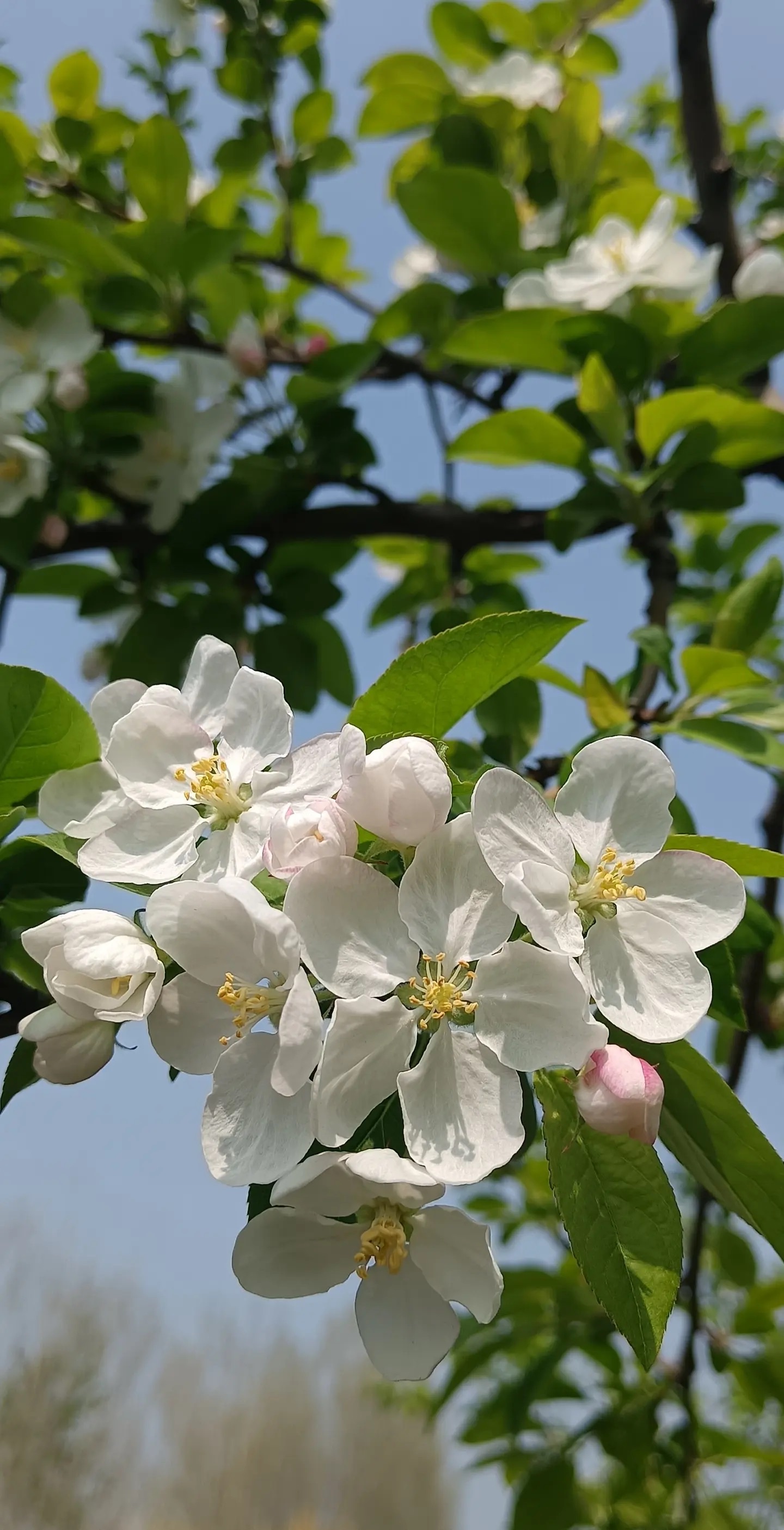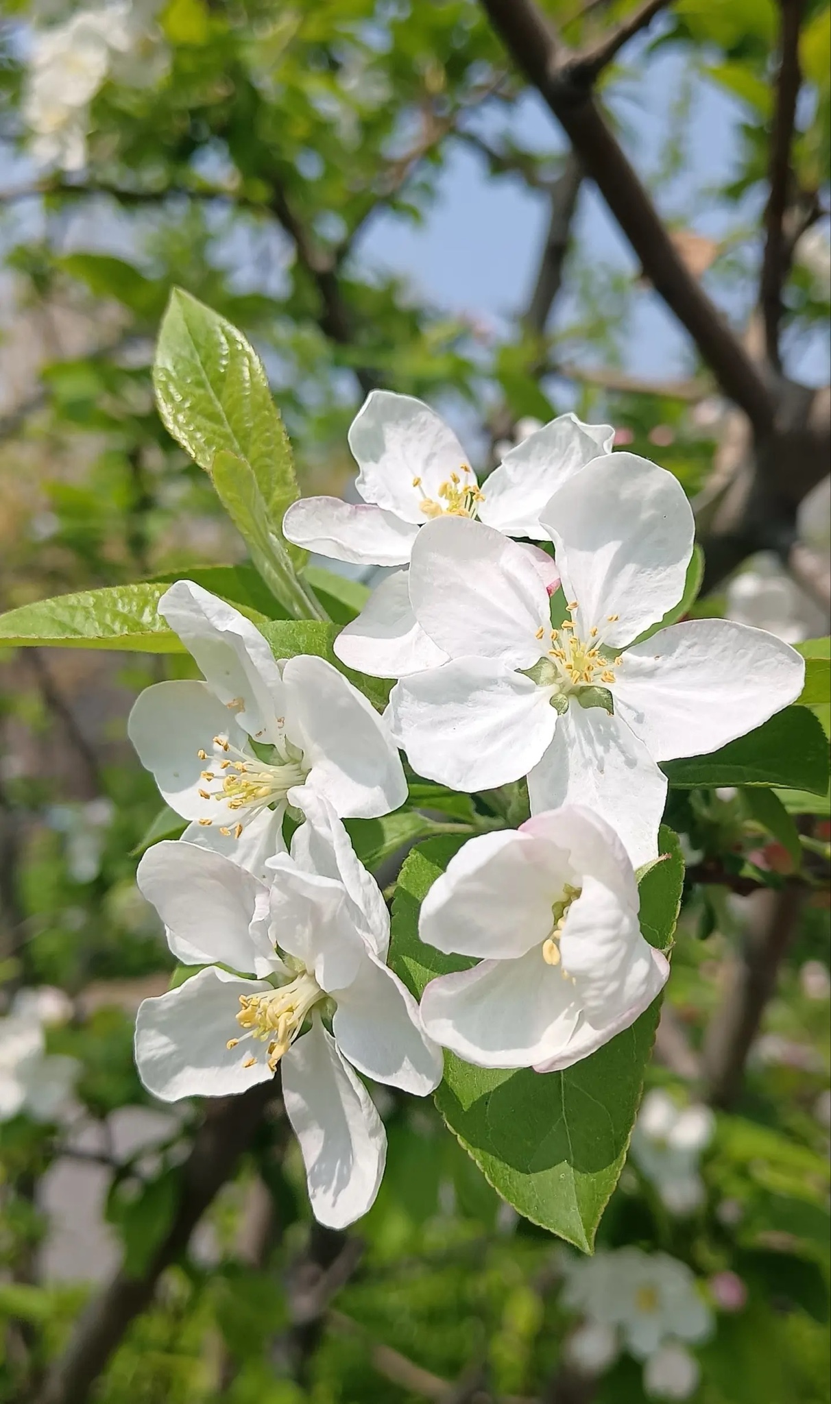 粉白花瓣踮脚攀上枝头,嫩绿新叶在风里轻轻翻页。蓝天是它最澄澈的底片,阳光为每朵花镀上微光。镜头凑近,五瓣玲珑托着金蕊,像春写给秋的第一封情书——未落果时,已藏满甜意。