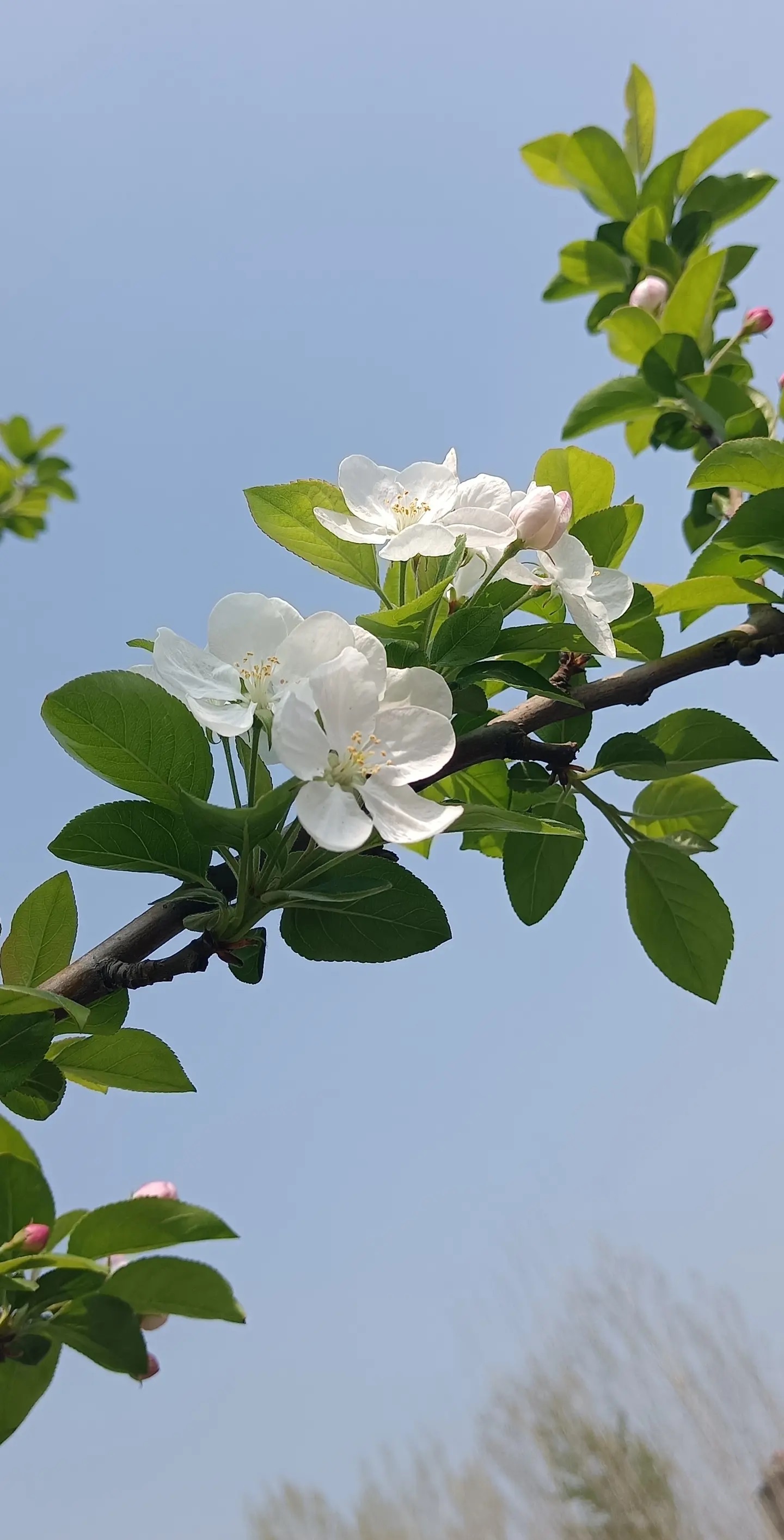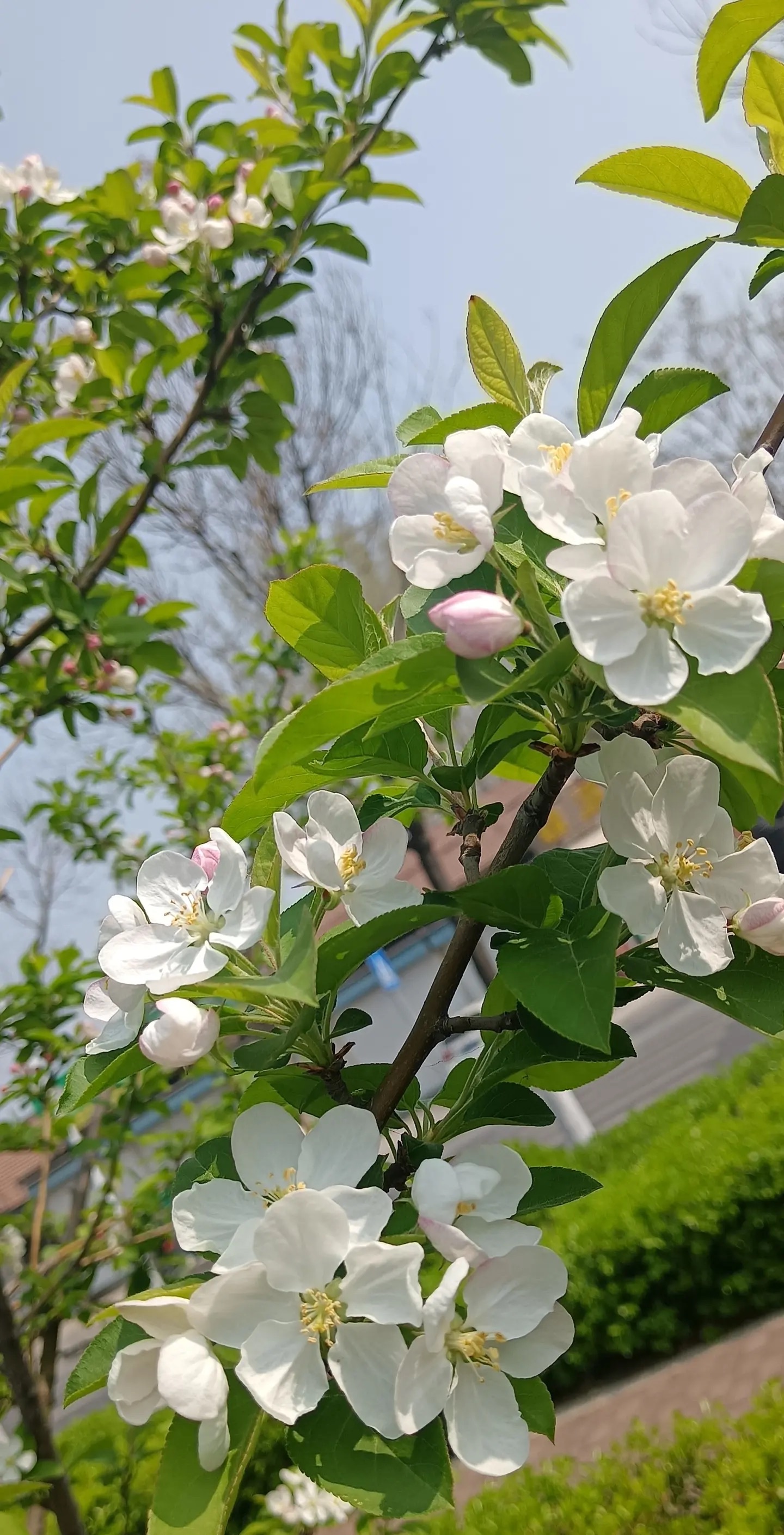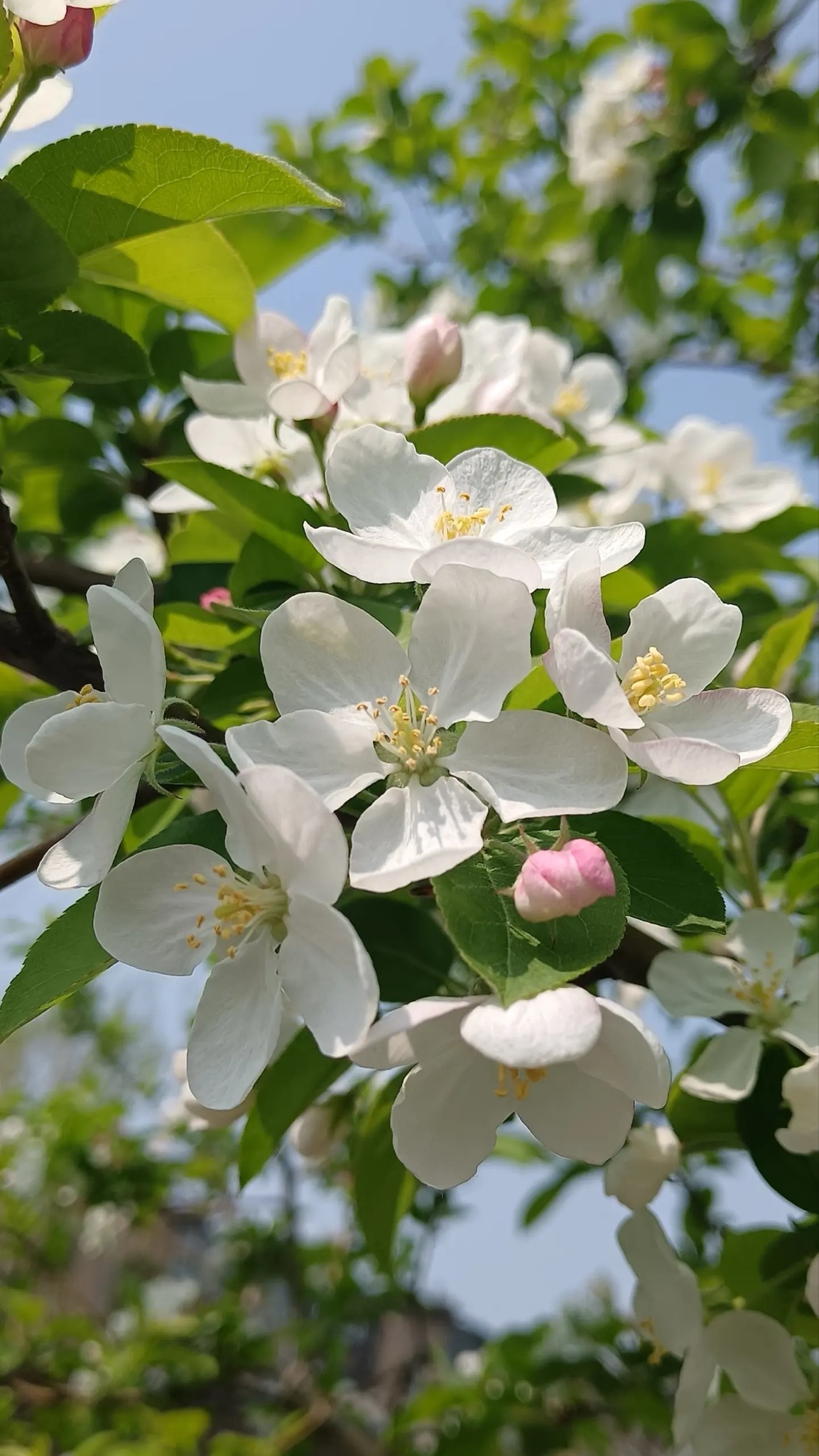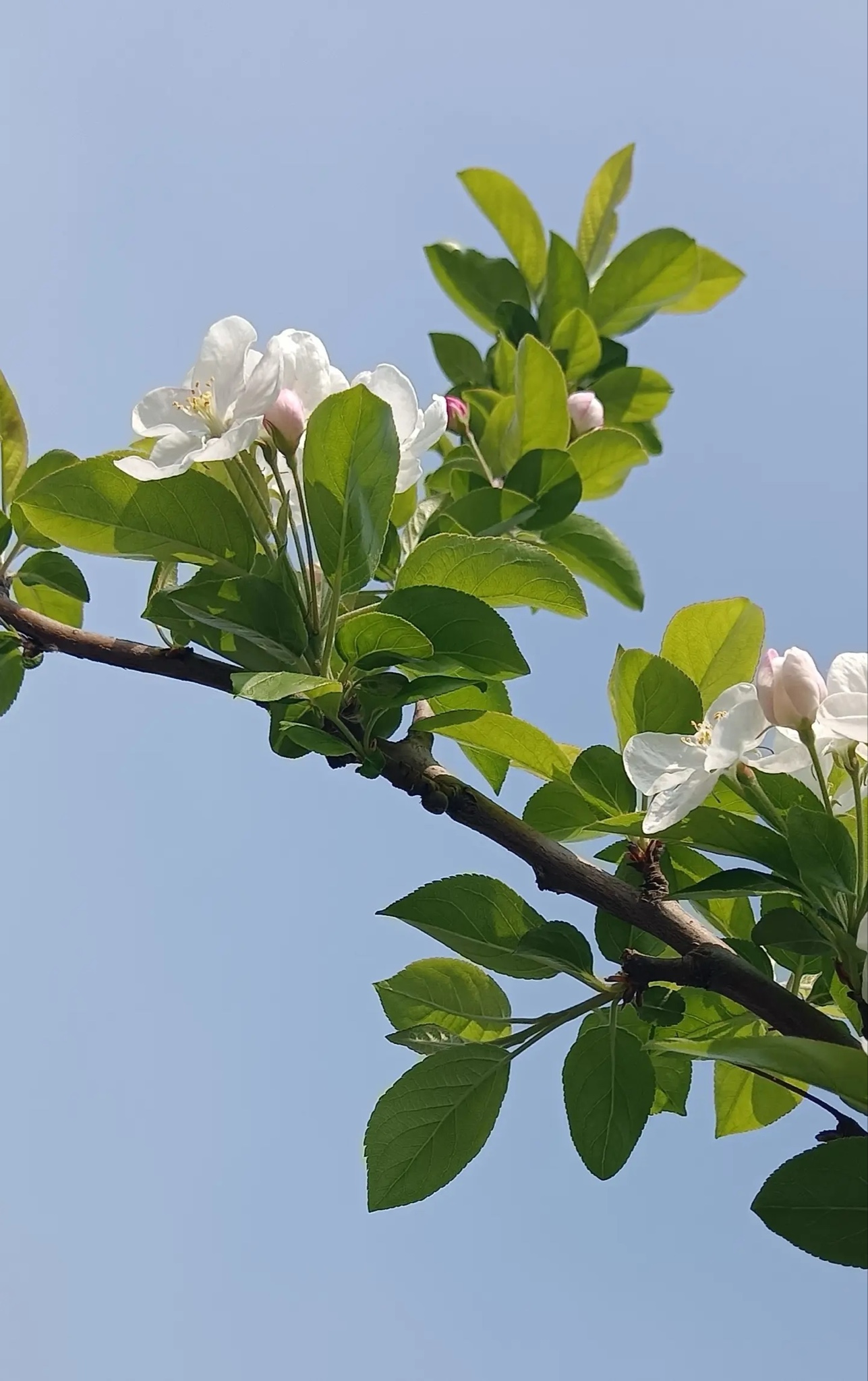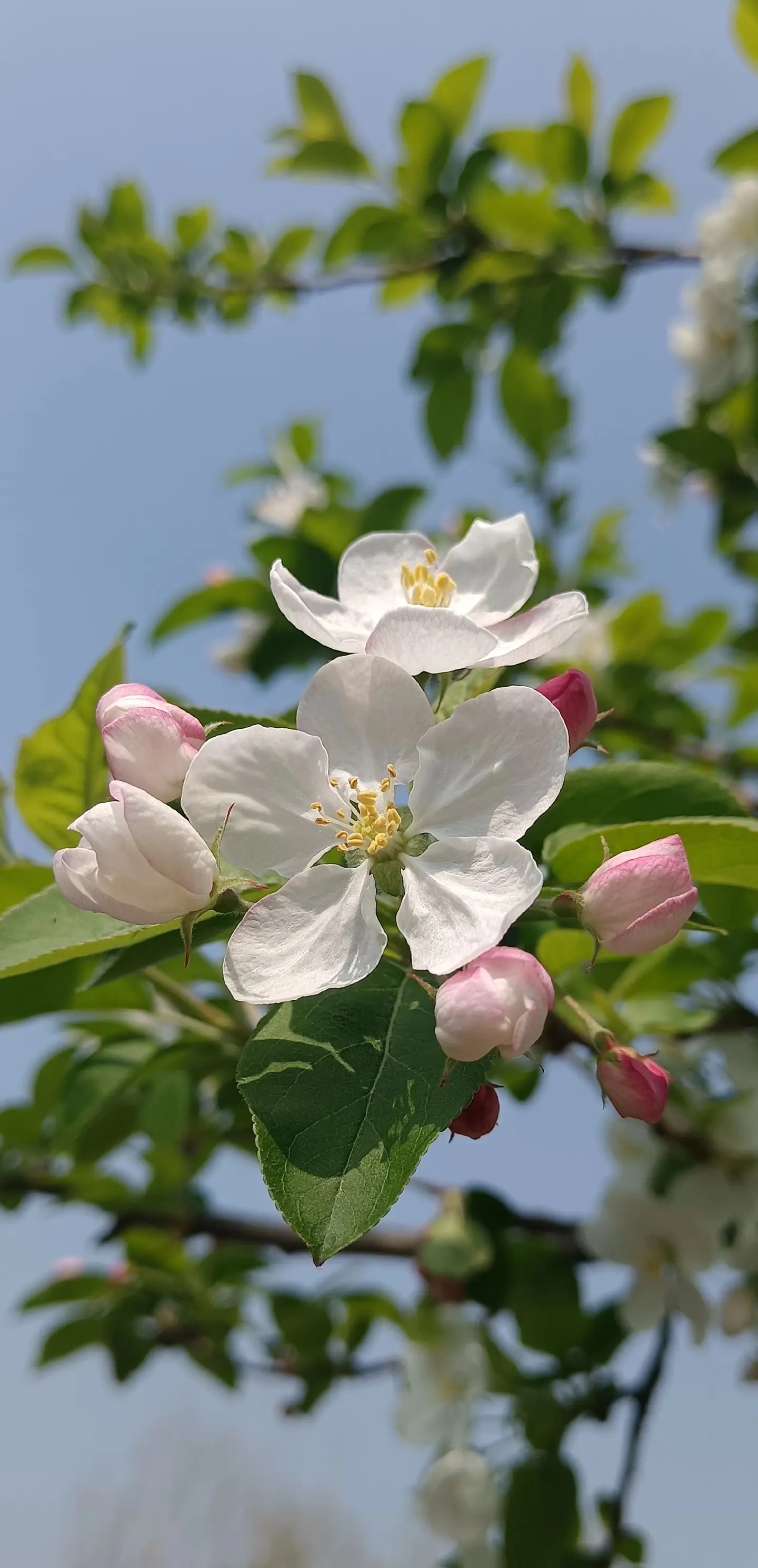 枝头初绽,粉苞如羞,白瓣似雪,嫩叶微漾。春光在苹果花间低语,风过处,香息轻绕。蓝天为幕,绿意作衬,一朵一世界,一瞬一永恒。俯身凝望,露珠在瓣尖打盹,蜜蜂驮着阳光掠过——原来最动人的构图,是自然亲手落笔的温柔。这个春天,我只拍花,不赶路。