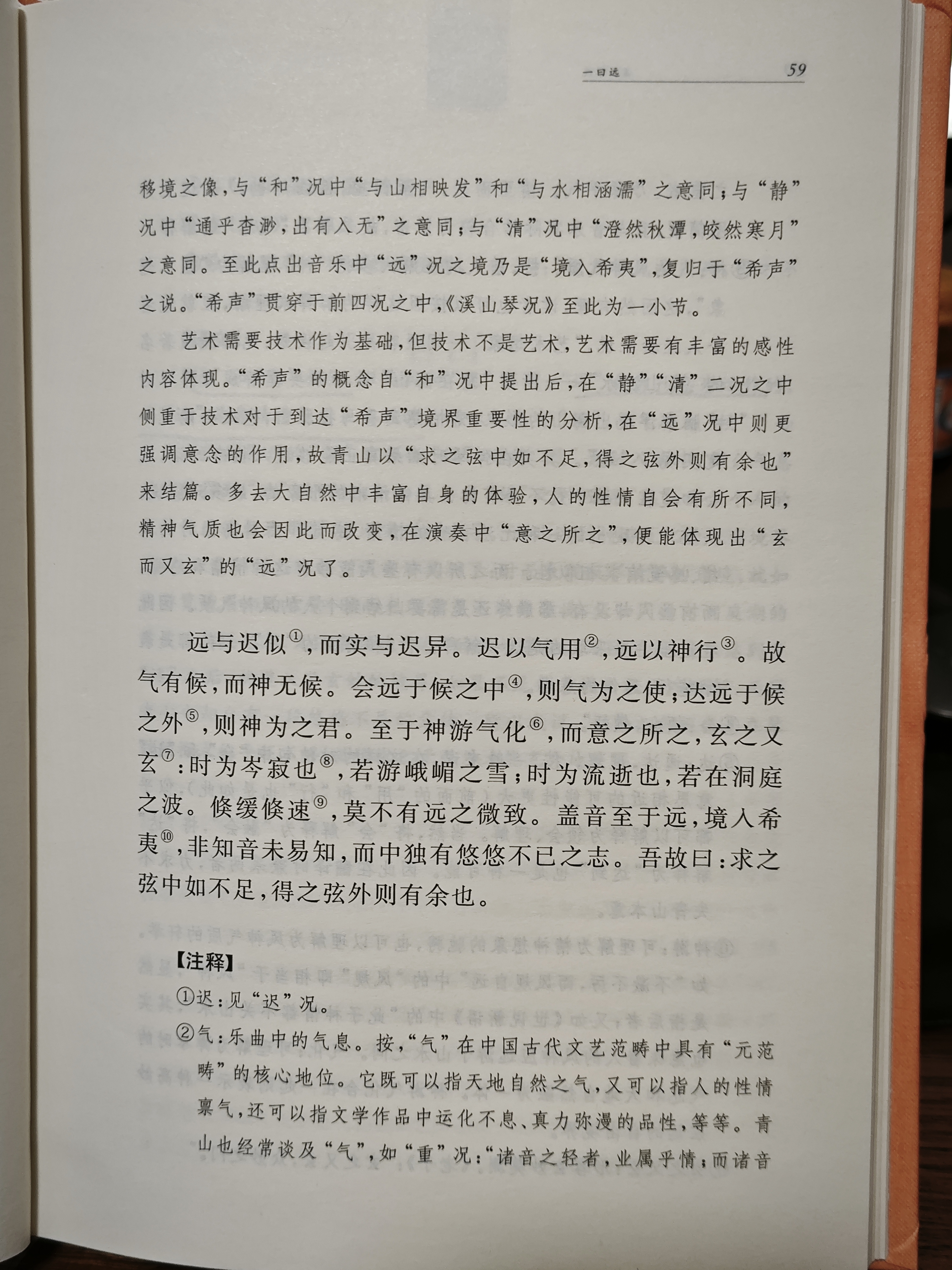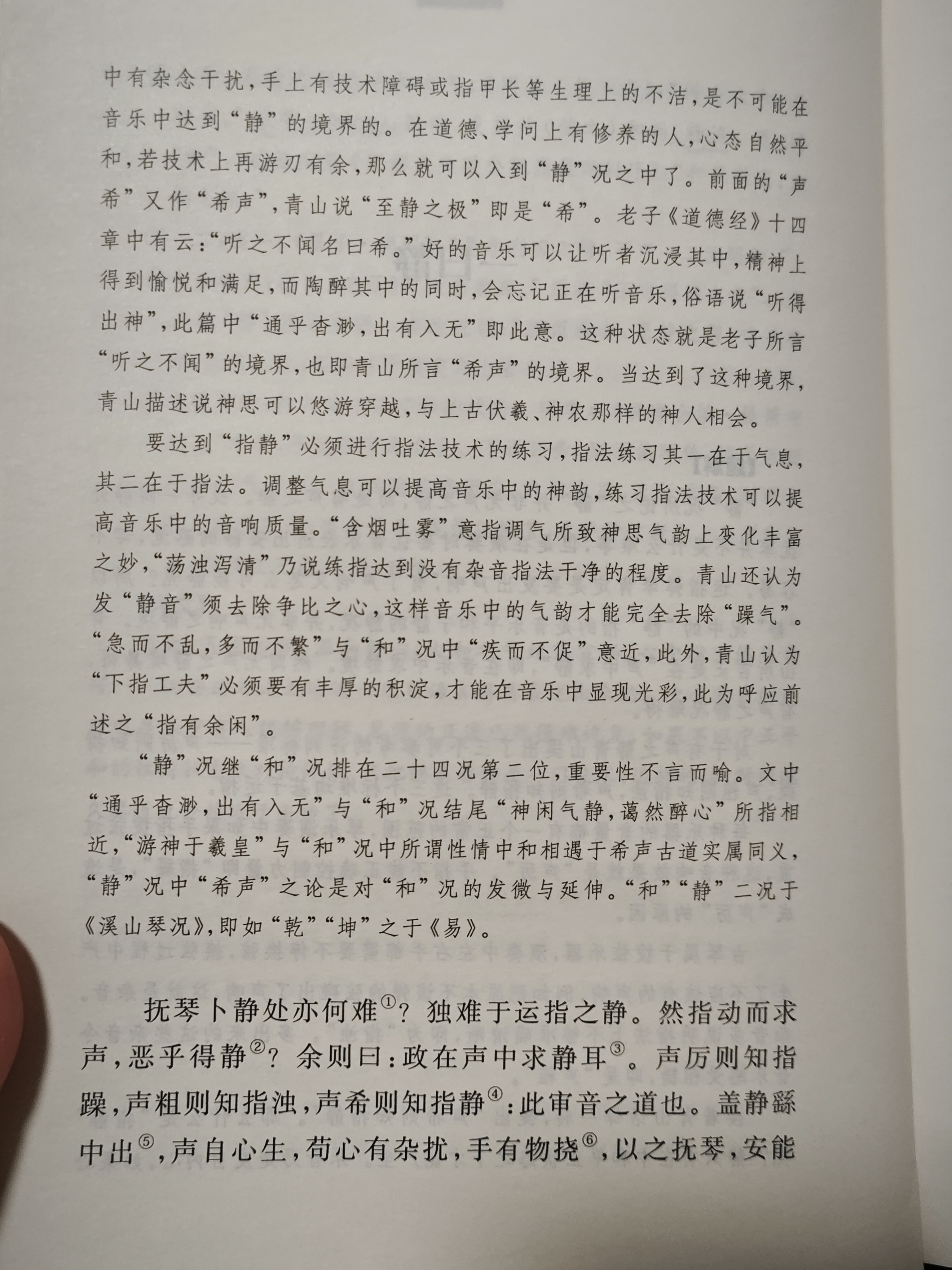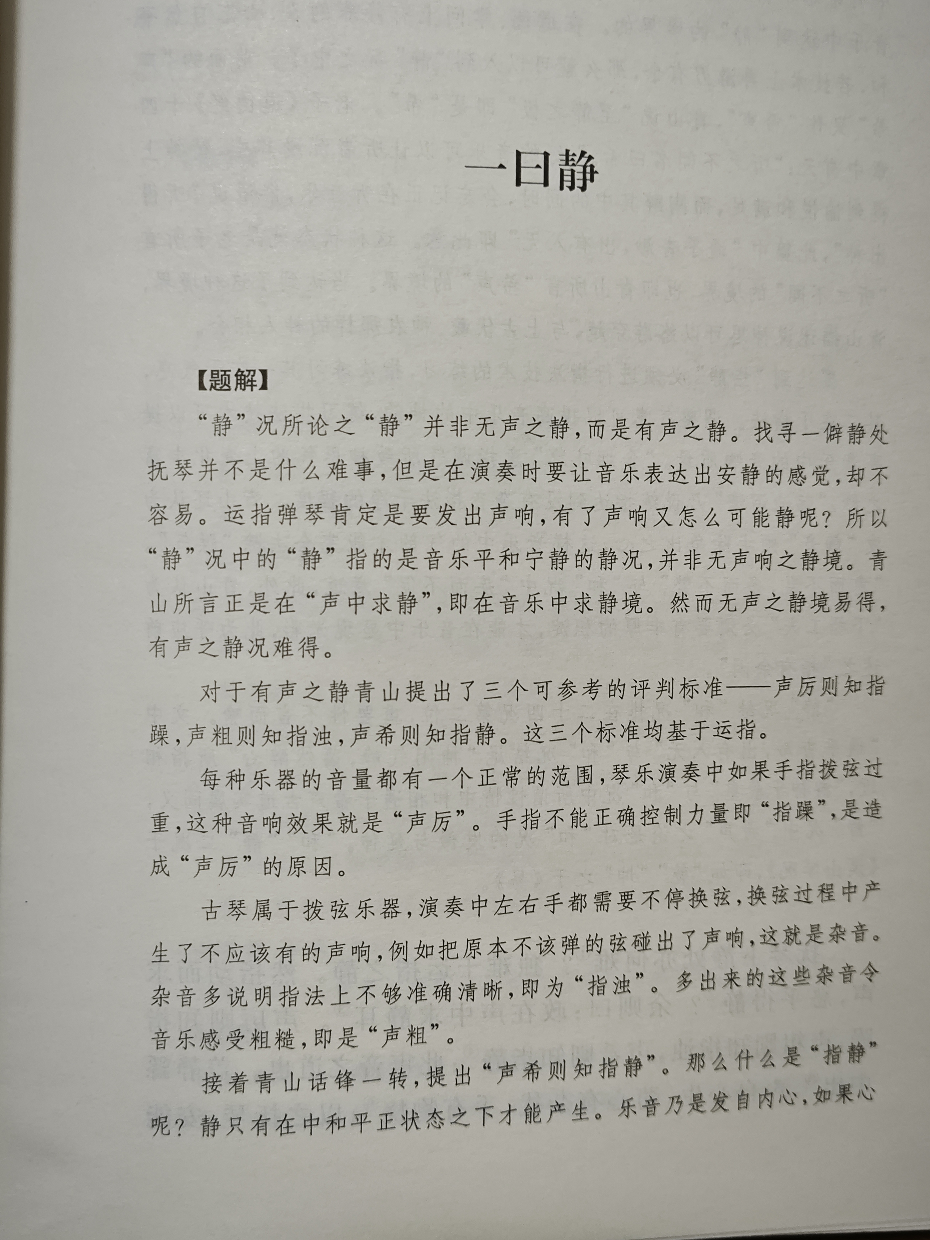 溪山琴况-三 一曰清 语云“弹琴不清,不如弹筝”,言失雅也。故清者,大雅之原本,而为声音之主宰。地而不僻则不清,琴不实则不清,弦不洁则不清,心不静则不清,气不肃则不清,皆清之至要者也,而指之清尤为最。 指求其劲,按求其实,则清音始出。手不下徽,弹不柔懦,则清音并发。而又挑必甲尖,弦必悬落,则清音益妙。两手如鸾凤和鸣,不染纤毫浊气,厝指如敲金戛石,傍弦绝无客声,此则练其清骨,以超乎诸音之上矣。 究夫曲调之清,则最忌连连弹去,亟亟求完,但欲热闹娱耳,不知意趣何在,斯则流于浊矣。故欲得其清调者,必以贞、静、宏、远为度,然后按以气候,从容宛转。候宜逗留,则将少息以俟之。候宜紧促,则用疾急以迎之。是以节奏有迟速之辨,吟猱有缓急之别,章句必欲分明,声调愈欲疏越,皆是一度一候,以全其终曲之雅趣。试一听之,澄然秋潭,皎然寒月,湱然山涛,幽然谷应,始知弦上有此一种清况,真令人心骨俱冷,体气欲仙矣。 《溪山琴况》“清”篇感悟 《溪山琴况》论“清”,开篇即将其确立为“大雅之原本”、“声音之主宰”,视“清”为古琴美学的核心与灵魂。此“清”并非单指音色的清脆,而是一个贯穿指法、心性、意境乃至人格的完整体系。它始于指法之净——“指求其劲,按求其实”,追求清响发乎纯粹精当的触弦;成于心境之澄——“心静则音清”,强调内心的澄明是清音的根本源泉;最终通达于格调之超逸——“清音之兴,必在澄心涤虑之后”,将艺术境界的“清”与人品修养的“清”紧密相连。 感悟 “清”是一种审美上的减法哲学。在繁复的技巧与浓烈的情感之上,徐青山推崇一种洗练、透澈、有骨力的表达。这要求演奏者必须克服指法的浊滞、气息的紊乱与心绪的杂芜,如同淘金炼玉,汰尽杂质,方见真纯。这种“清”,在听觉上呈现为一种疏朗空灵的空间感,在精神上则表现为一种超然物外的逸气与风骨。它拒绝甜媚、油滑与浑浊,崇尚的是“山水清音”般的自然与本真。 更深层地看,“清”是心性修养在艺术中的外化。“修其清净贞正”,方能“藉琴以明心见性”。琴音之清浊,直接映照出抚琴者内心的明暗。因此,习琴的过程,便成为一个不断向内磨砺心镜、扫除心灵“尘翫”的过程。当内心廓然无翳,指下自然生发出一片“清光”。这种由内而外、心手相应的“清”,使得古琴艺术超越单纯的音乐演奏,成为士人修身养性、砥砺人格的道器。在追求“清音”的道路上,人亦在追求成为一个“清正”的人。 清者,大雅之原本,而为声音之主宰。 指求其劲,按求其实,则清音始出。 心静则音清,心远则意清。 清音之兴,必在澄心涤虑之后,修其清净贞正,而藉琴以明心见性。 故欲得其清调者,必以贞、静、宏、远为度,然后心能御声,声能御指。 —— 求“清”之途,实以贞静的胸怀与高远的志趣为根基,达到心、声、指三者圆融御使的化境。