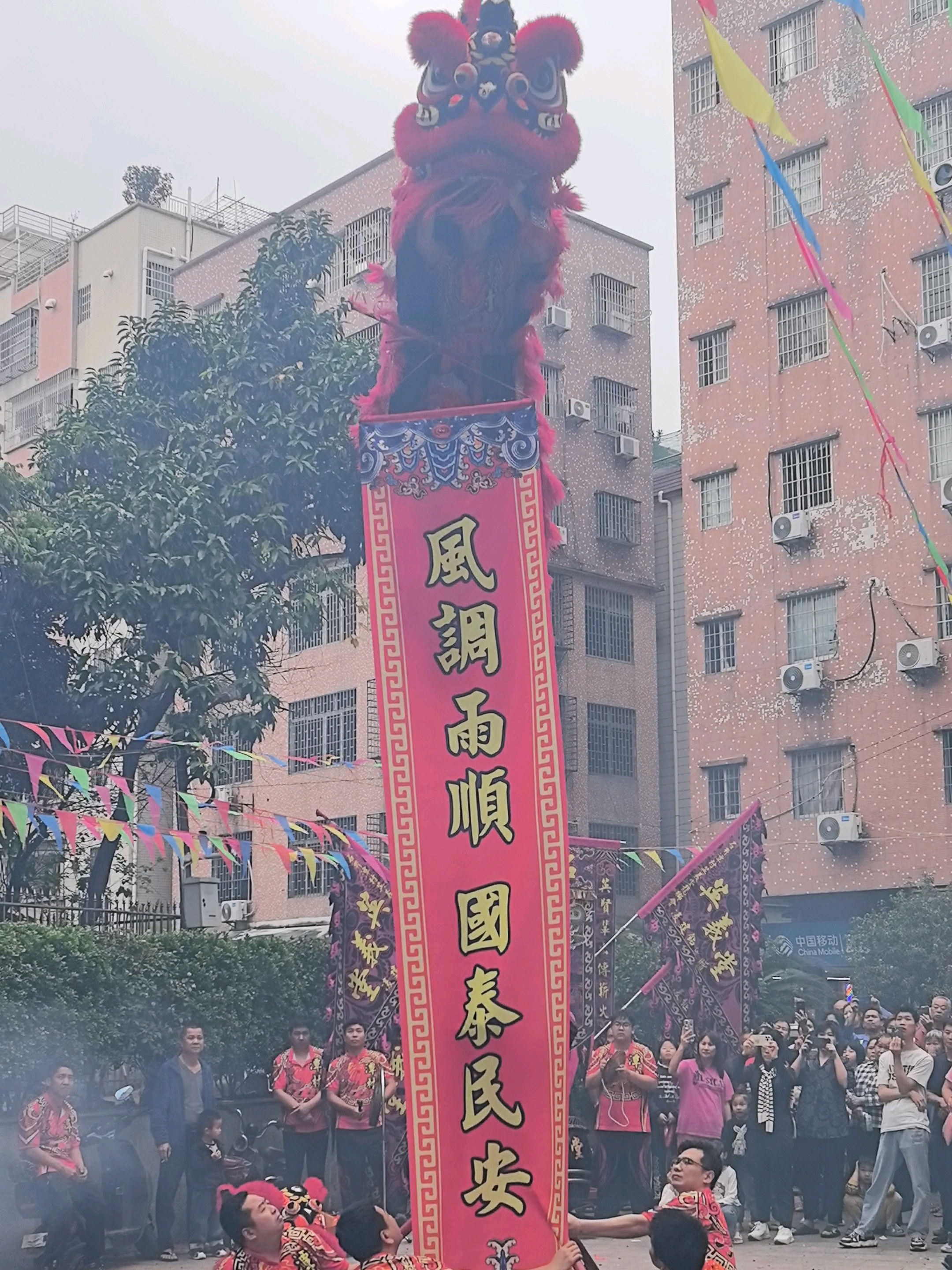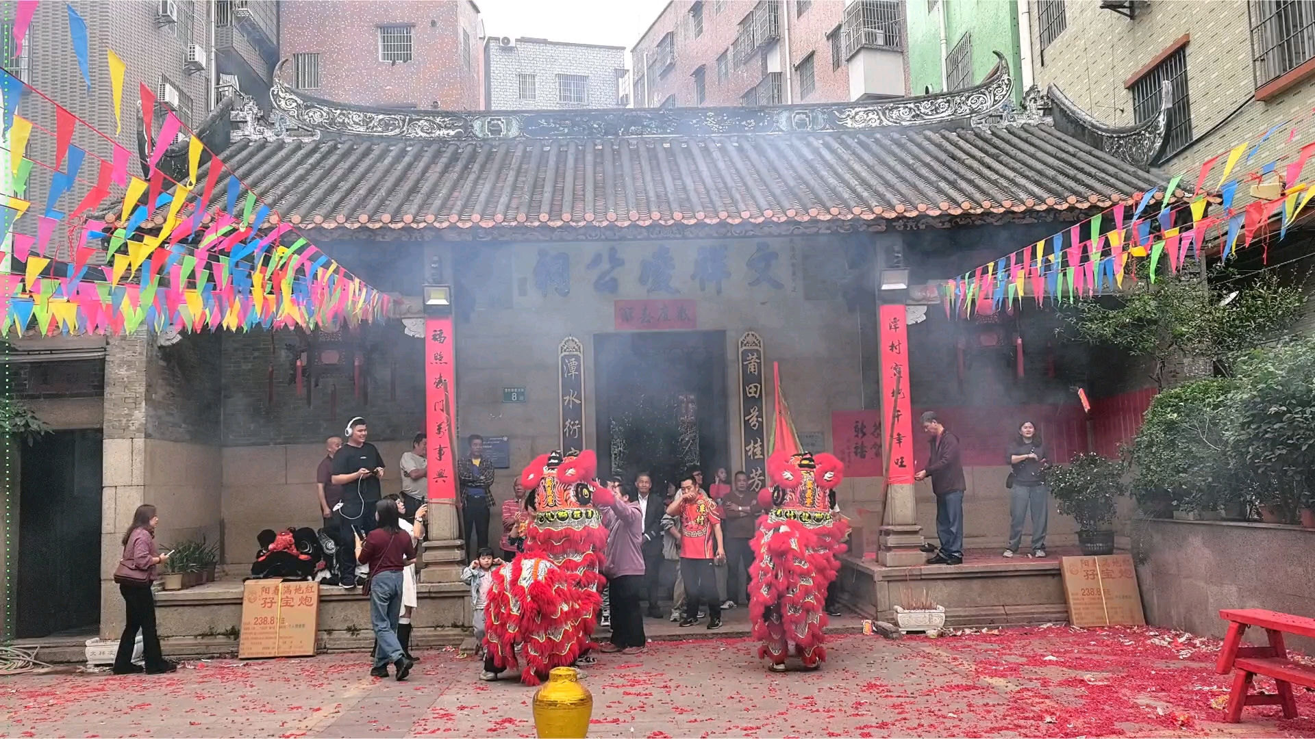 黑狮红狮贺元宵 元宵佳节,瑞狮临门,广州白云石井潭村文祥凌公祠前,红狮黑狮联袂腾跃,共贺新岁吉祥 。 红狮为关公狮,红面长须,气度端方。其寓意忠义正气、红火纳福,恰合凌氏先祖爱国传家之风,祈愿宗族和睦、财丁两旺、万事顺遂。 黑狮为张飞狮,黑面刚劲,势如雷霆。其象征勇猛刚烈、镇宅扬威,彰显凌氏一脉勇毅立身之骨,守护家宅安宁、扫除晦气、提振宗族精气神。