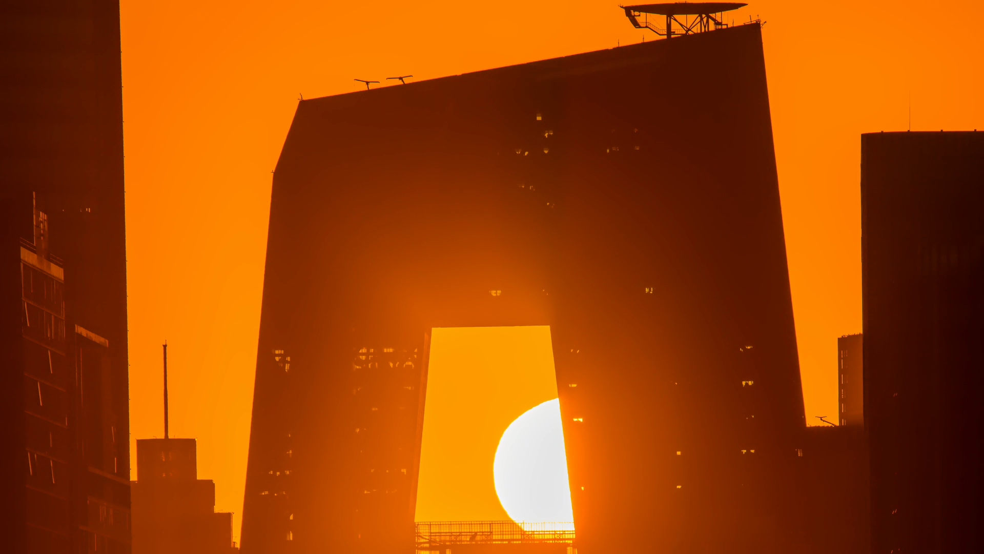 每年春分前后太阳刚好从央视大楼中间划过,光明永不迟到!