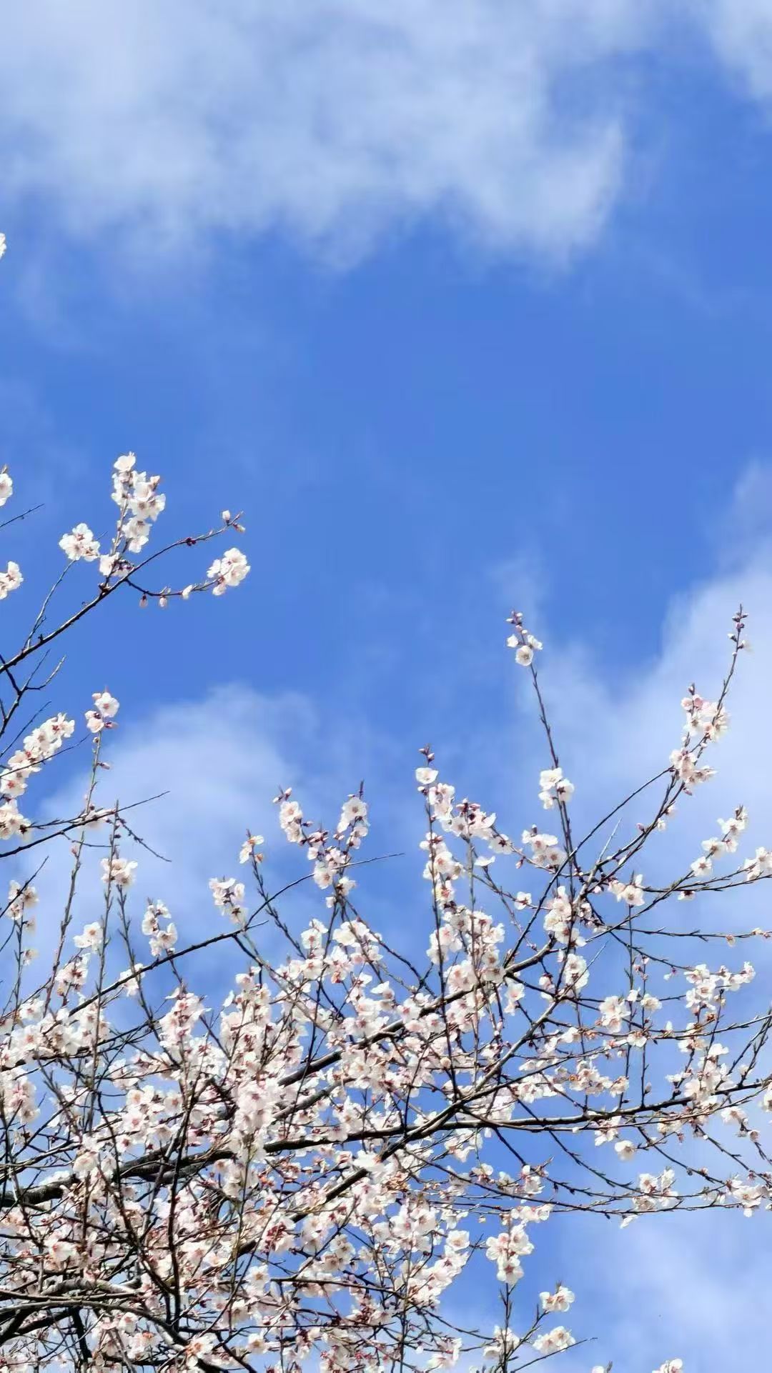 樱枝斜挑碧空,云絮浮游其间。风过处,粉雪轻旋,春在枝头低语…