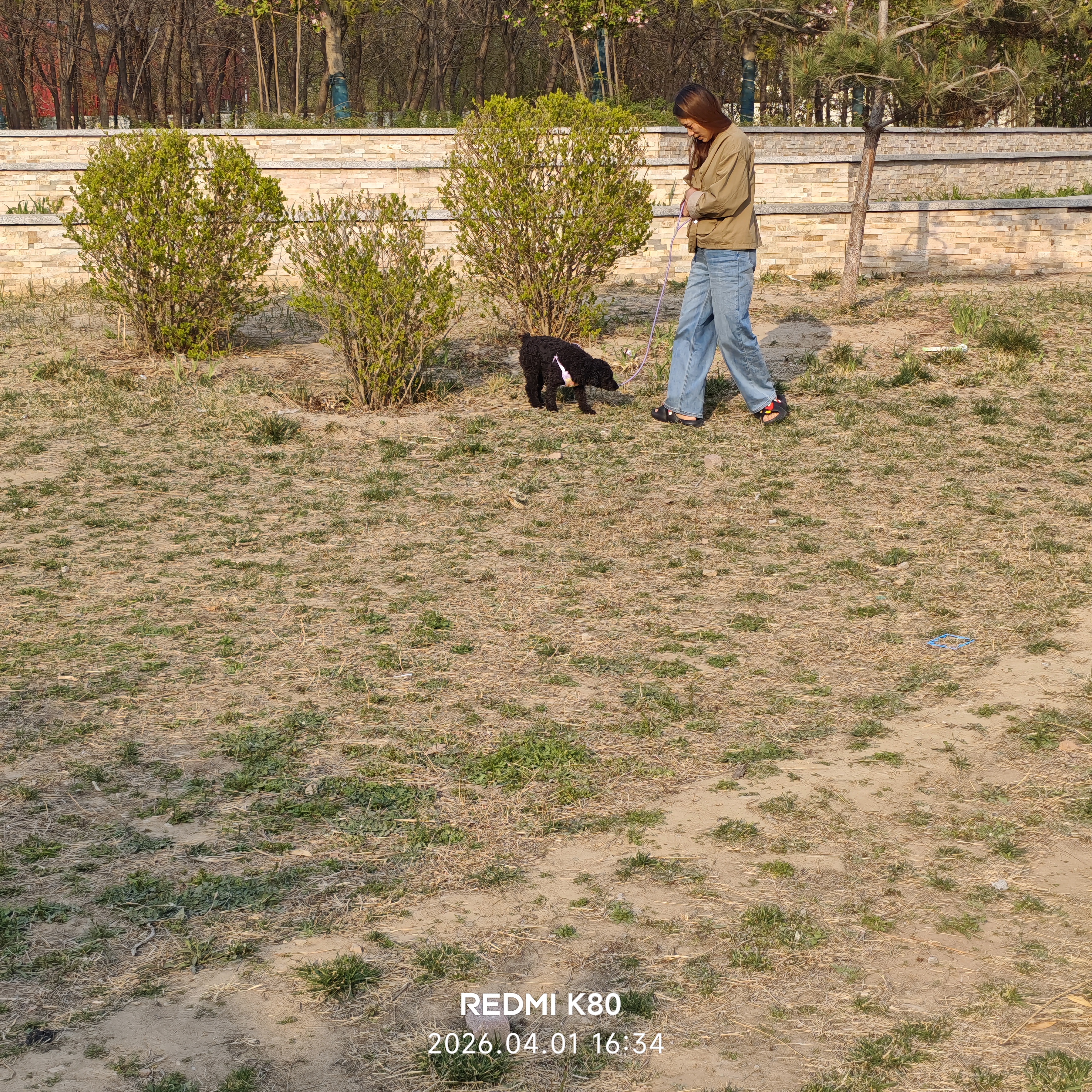 一个纤绳遛狗的女孩!