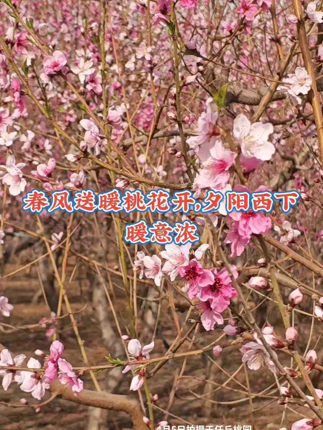 《四月桃花》 晴光暖透小阑干,四月桃花带露丹。 粉靥匀开春十里,香风漫过玉栏干。 蜂迷艳蕊情难已,蝶绕繁枝舞未阑。 最是夕阳斜照处,半江霞色共花残。 美丽任丘,我的家乡!
