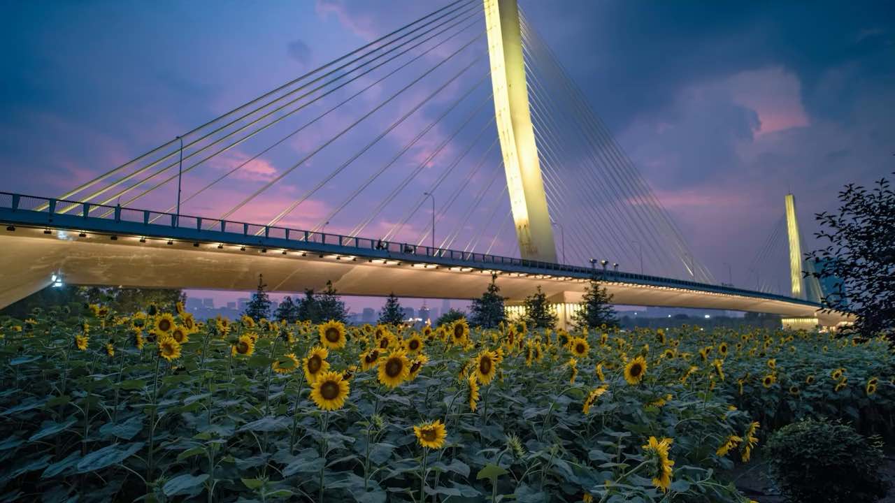 沈阳富民桥下的向日葵花海,以城市蓝调为背景,显得更有生命力!