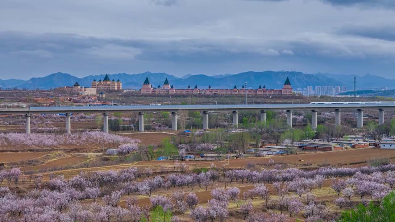 春季桃花花海拍摄于2025年4月10日,位于朝阳市“桃花吐”高速服务区。