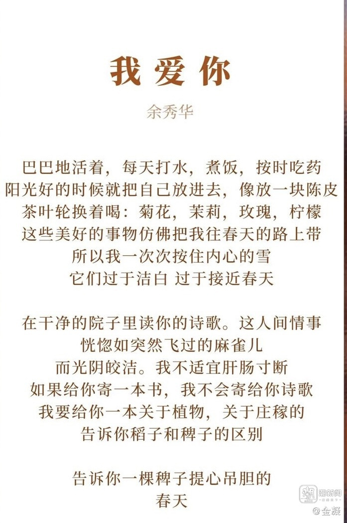 我想我喜欢余秀华是因为我在她的诗歌中看到了她对故乡的深情,对爱情的坦诚,对平凡生活的敏锐感悟,引发了我的共情。