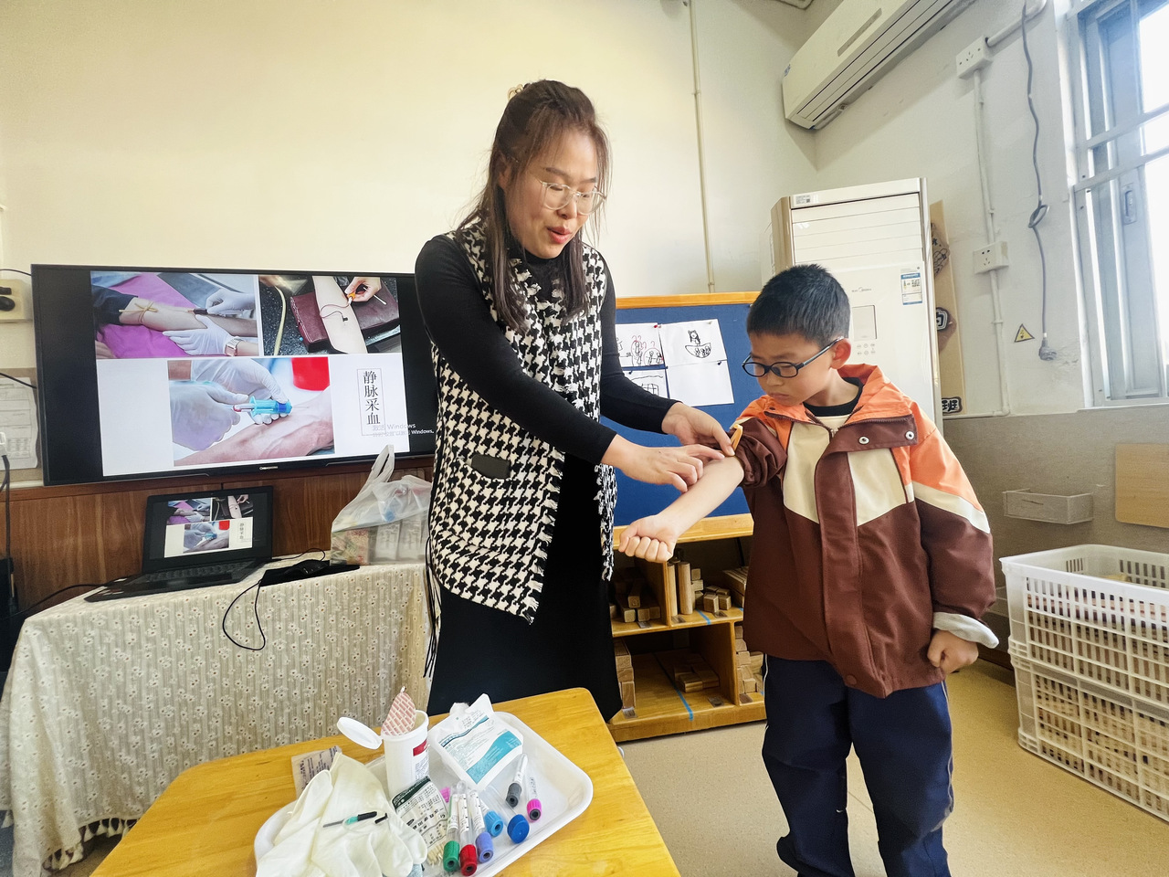 大三班孙清心妈妈带小朋友们了解了采血的那些事儿,孩子们知道了采血有两种方式,也认识了医用材料的名称,更是在情景模拟中尝试了一把采血全过程,真是一次有趣的体验。