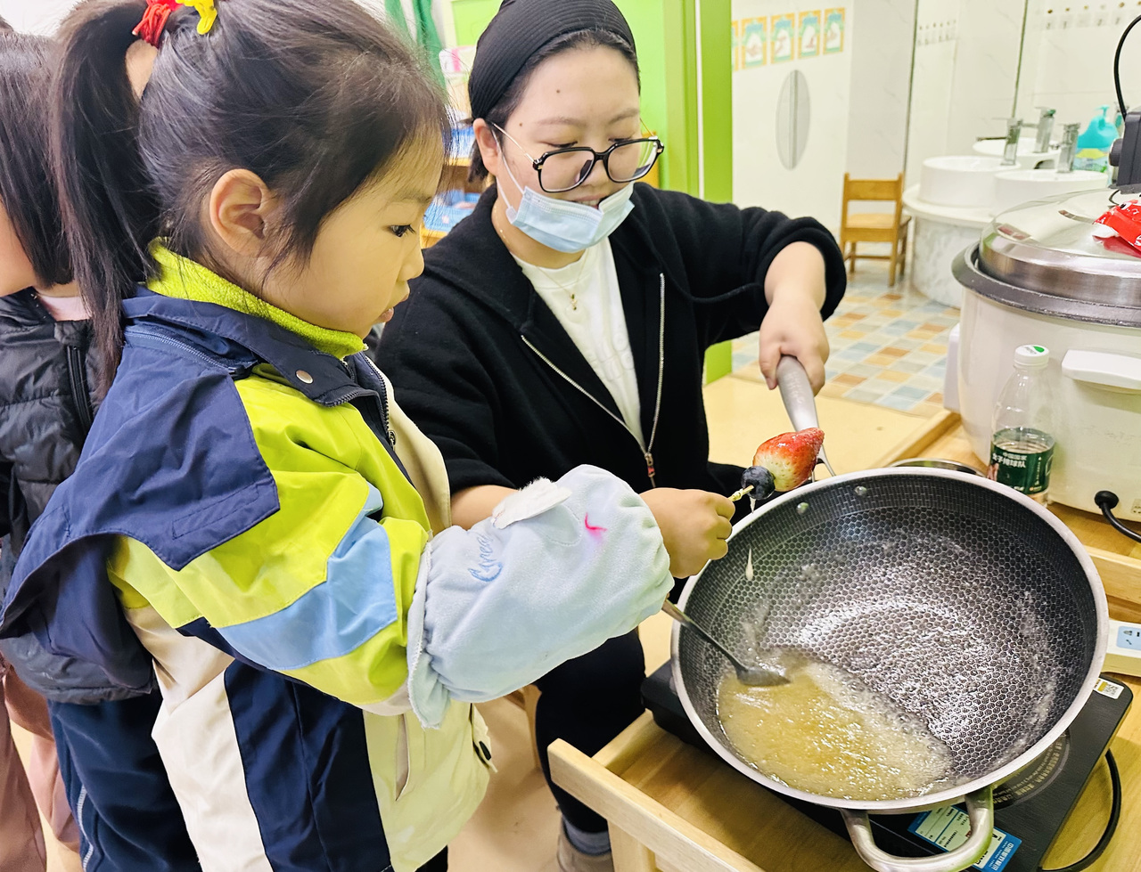 大四班纪顺鑫妈妈带孩子们体验了糖葫芦的制作过程,小朋友们实现了糖葫芦自由,挑选喜欢的水果,串在一起,裹上糖浆,好看又好吃的水果糖葫芦串就完成啦~满满的开心甜蜜哟!