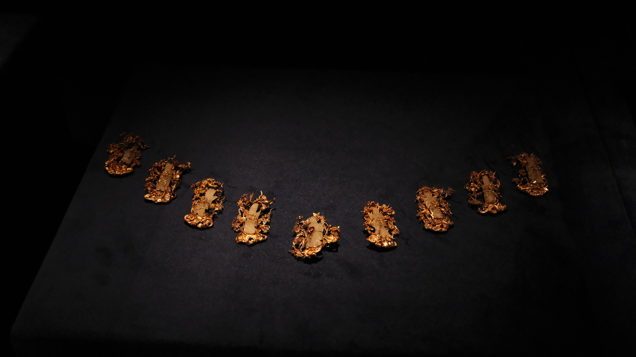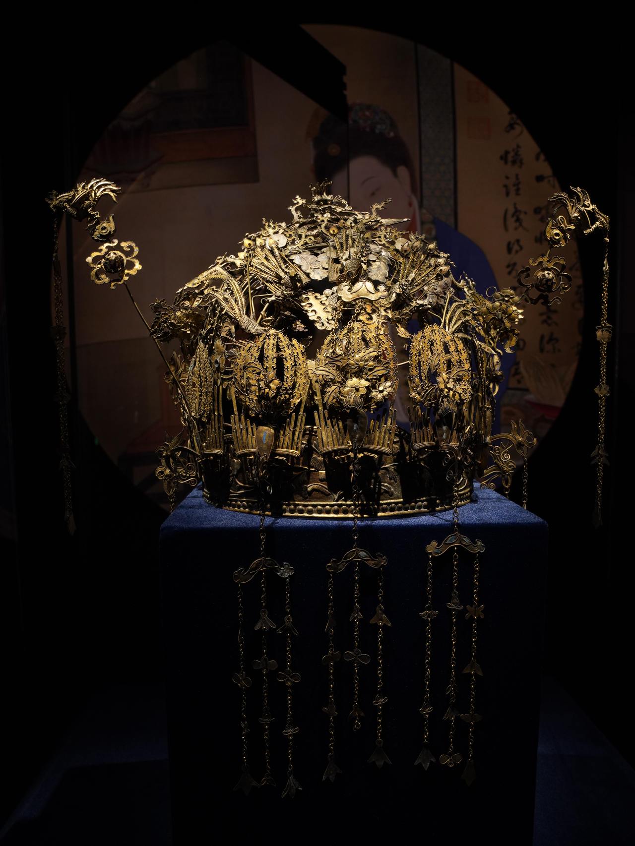 本次展览汇聚了国内顶级文博机构的典藏珍品十余件,其中定州博物馆藏“鎏金点翠嵌宝龙凤冠”无疑是最受瞩目的焦点之一。这件展品装点三龙十八凤,展现了清朝的宫廷审美与高超技艺。来自内蒙古博物院的“鎏金点翠凤冠”随清朝公主下嫁被带到蒙地,成为两地文化交流与融合的见证。此次国内馆藏瑰宝的集中展示,让观众领略到不同历史时期中国艺术的辉煌成就,也通过横向对比,揭示了工艺技术、审美趣味的演变过程。