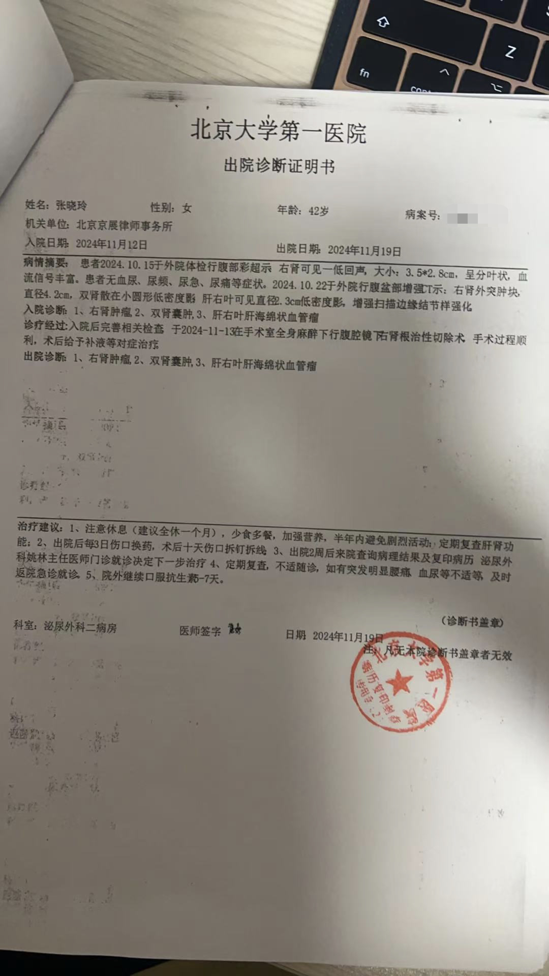 2024年11月,张晓玲在北京大学第一医院(以下简称“北大医院”)接受右肾摘除术。
