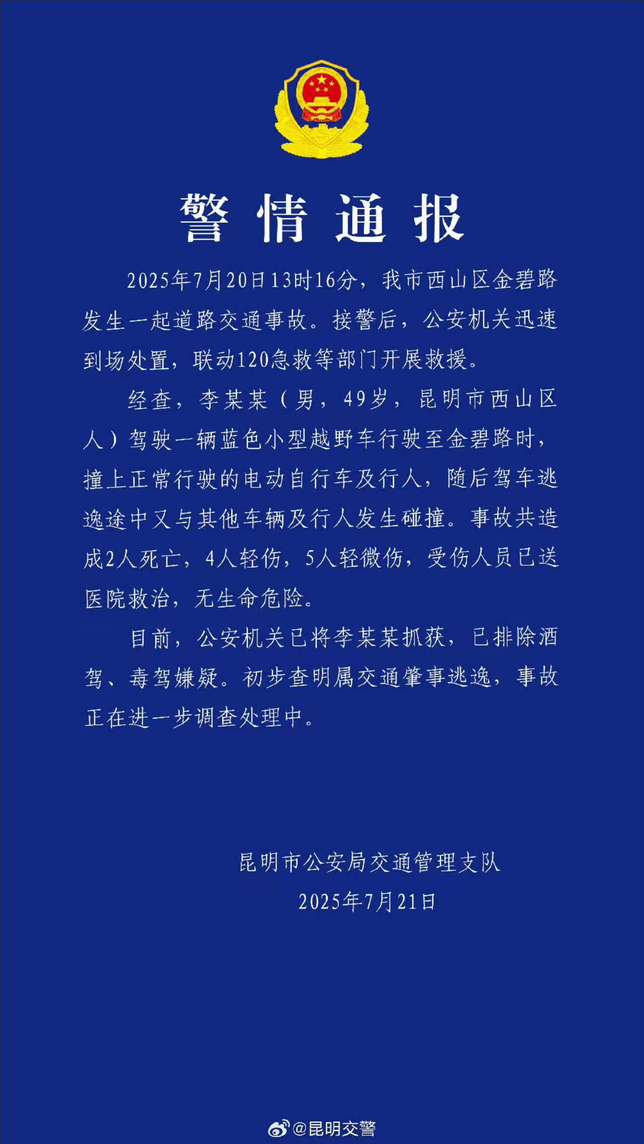 7月21日,昆明市一起交通事故引发关注。昆明交警通报,事故共造成2人死亡,4人轻伤,5人轻微伤,受伤人员已送医院救治,无生命危险。初步查明属交通肇事逃逸,事故正在进一步调查处理中。