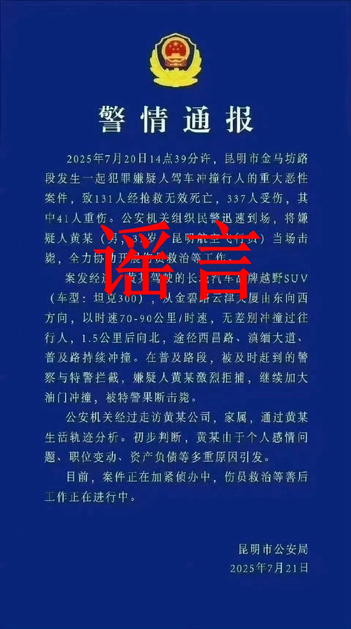 潮新闻注意到,在网上一些平台,流传着关于该起事故的“警情通报”,该通报称:2025年7月20日14点39分许,昆明市金马坊路段发生一起犯罪嫌疑人驾车冲撞行人的重大恶性案件,致131人经抢救无效死亡,337人受伤,其中41人重伤。公安机关组织民警迅速到场,将嫌疑人黄某(男,37岁,昆明航空飞行员)当场击毙,全力协助开展伤员救治等工作。