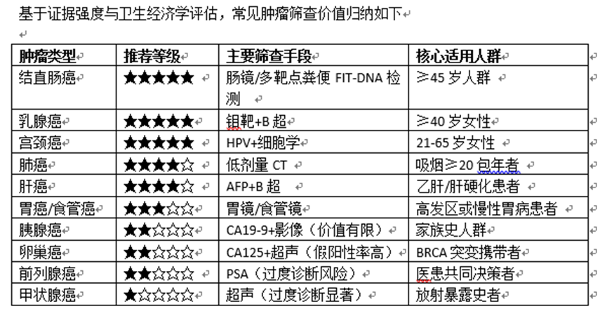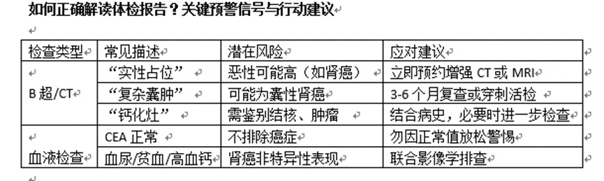 高文仓:首先,根据风险定制项目,比如:肾癌的高危人群包括长期吸烟、高血压及家族肾癌史,需要每年肾脏B超+每2-3年腹部增强CT(40岁后),避免无效项目如CEA(除非有胃肠癌风险),而普通人群:年度B超筛查足矣。