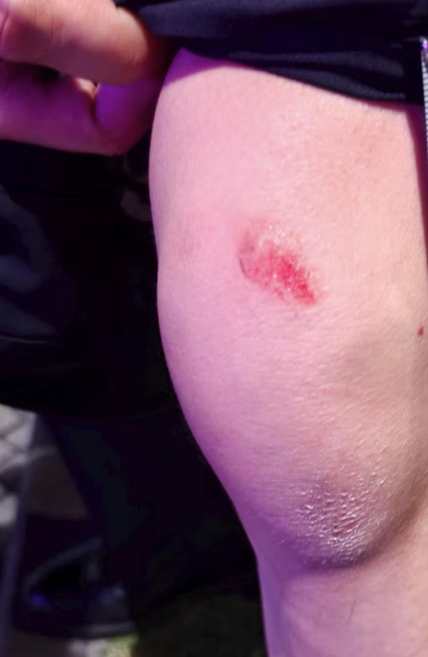 双腿膝盖部位都有点肿,还擦破了皮。“一开始我以为就是扭伤,疼痛的话也能忍的。”他说,当时想着坚持一下就好了。