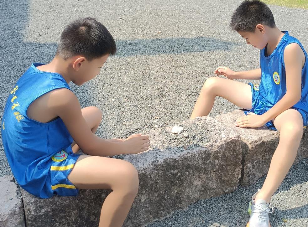 他们趁休息间隙,一起坐石块上抓起地上的沙石也放石块上,你来我往,喊着口号玩得正欢。快乐成长,快乐相伴。(原帖点这里)