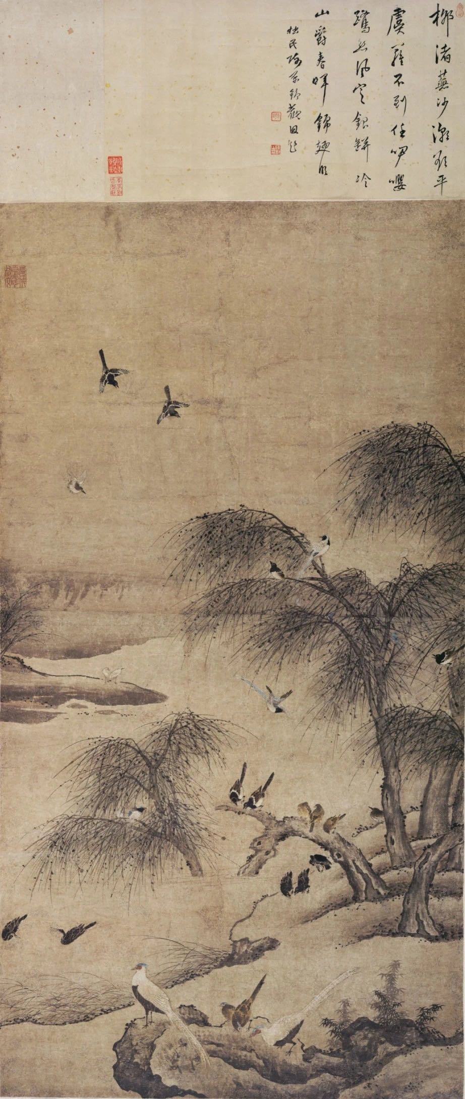 丰城画家夏叔文描绘了春日水岸,柳枝摇曳,喜鹊、山雉、翠鸟等十数种禽鸟或栖枝、或嬉水、或觅食、或飞翔,用笔工整,设色妍丽,尽显“水暖鸭知”的盎然春意。画上方有清代陈舒的题诗,诗画相映成趣。细观鸟儿们的神态动作,栩栩如生,仿佛能听到它们的鸣叫,感受到那份自然的野趣与和谐。