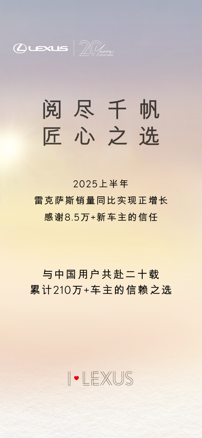 自2005年进入中国,雷克萨斯品牌已经深耕中国市场20周年。20年来,对于品质可靠性的坚持使得雷克萨斯赢得了超210万中国用户,从产品技术的持续革新到服务体系的不断完善,雷克萨斯正以更深入的本土化策略,规划未来全方位的发展。
