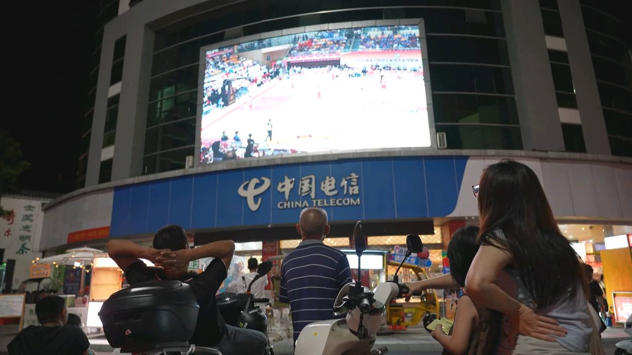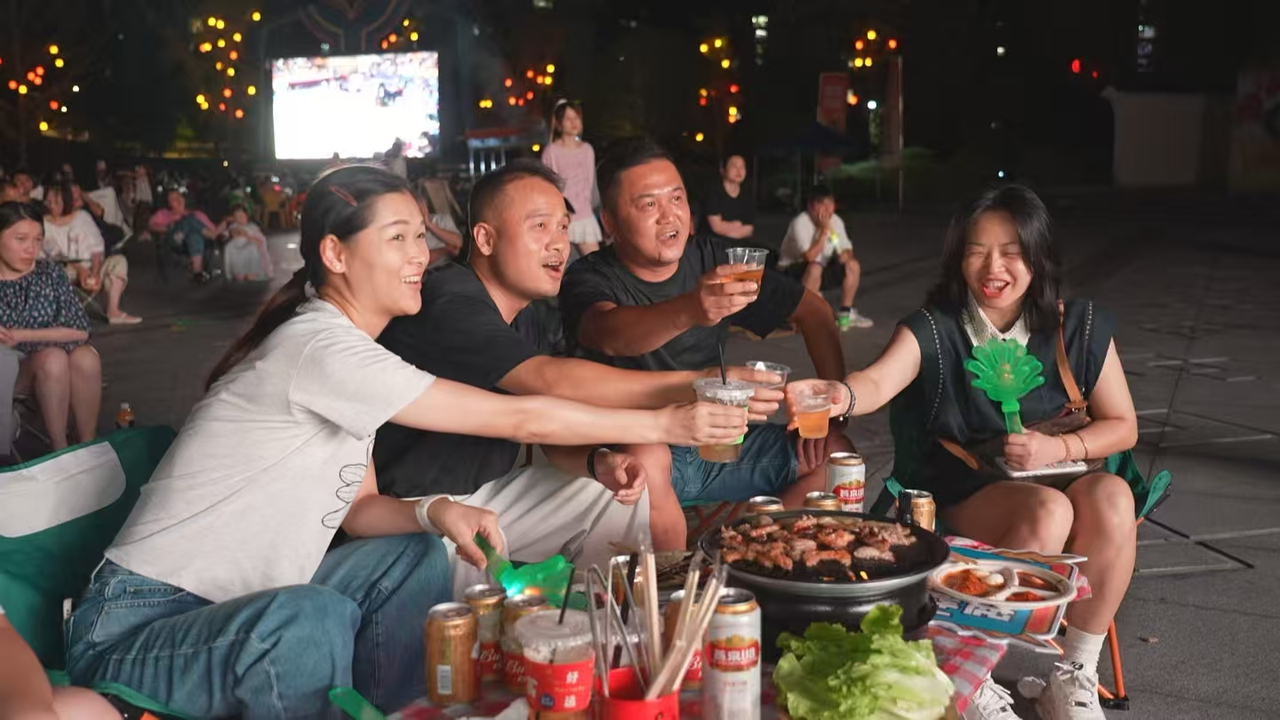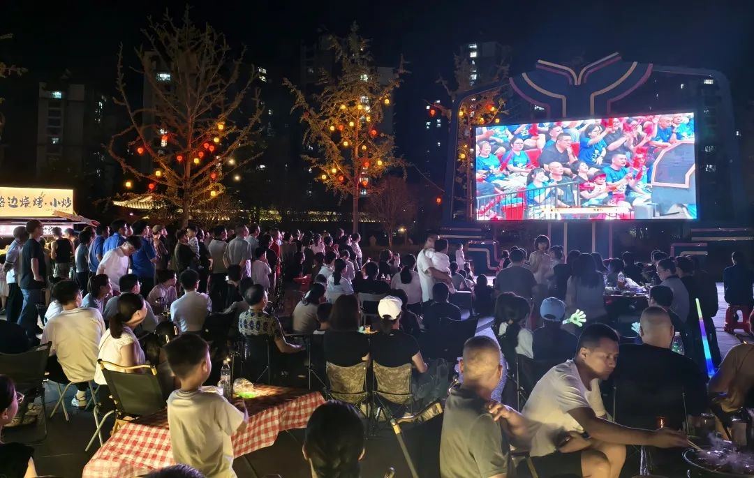 夜幕降临时,三月三广场和电信大厅文化街区的观赛点早已座无虚席。巨型屏幕前人头攒动,欢呼声浪里,冰镇啤酒的泡沫在碰杯中飞溅,近百张桌上堆起的小龙虾山冒着热气。有老人带着孙子举着应援棒呐喊,有年轻人边剥虾边讨论战术,畲乡的夏夜,因这场球赛有了别样的烟火气。