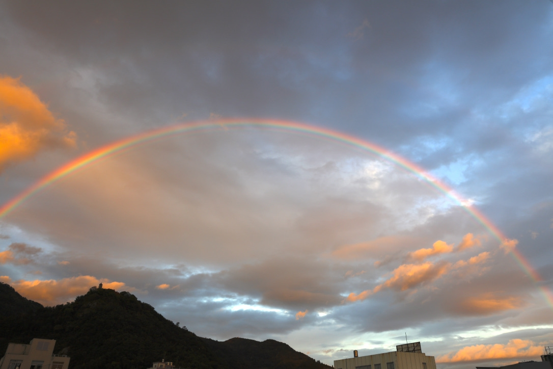 天空正以肉眼可见的速度褪去铅灰色。云层像是被一只无形的手掀开了边角,露出后面澄澈的蓝,那蓝色干净得像是刚从陶瓮里倒出的新酿,带着微醺的透亮。就在这片逐渐舒展的晴空里,一道弧形的光带正慢慢显形,起初只是淡淡的一抹,像谁不小心在天幕上扫了一笔水彩,转瞬之间,颜色便汹涌起来,红、橙、黄、绿、蓝、靛、紫,七种颜色像是被施了魔法,争先恐后地在云层间铺展开来。