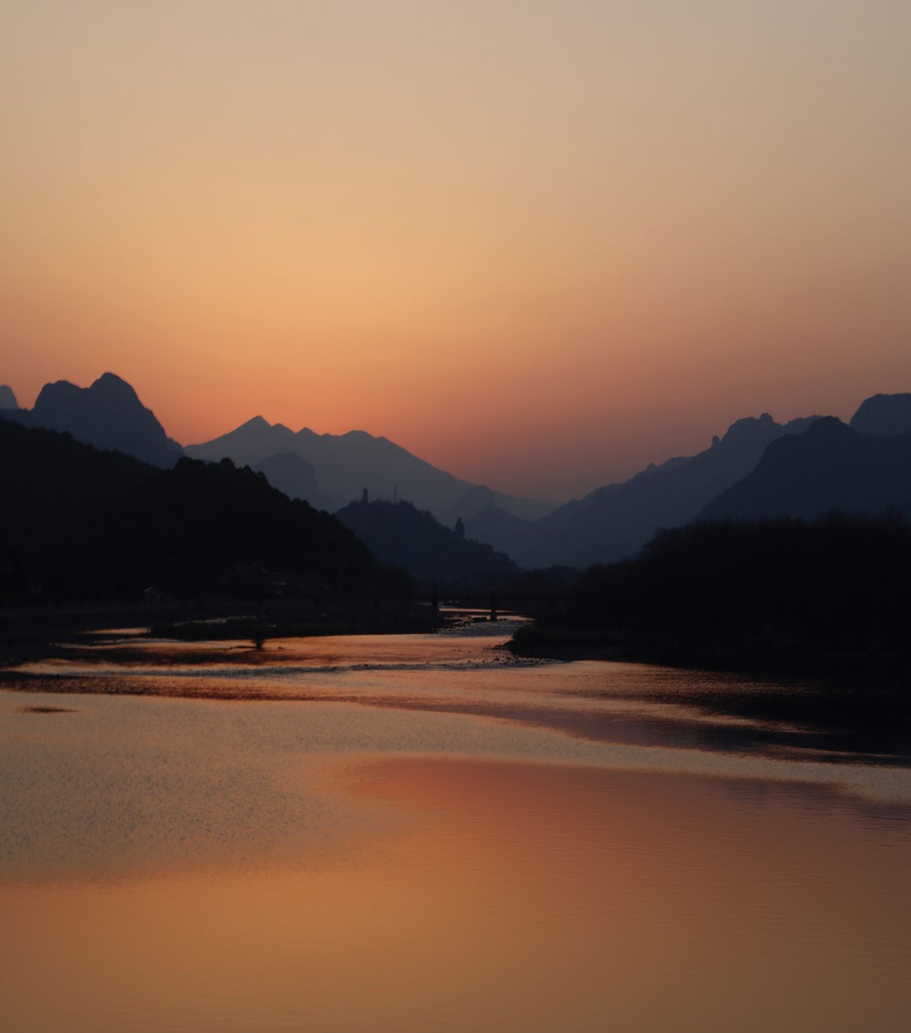 山间的日落则多了几分含蓄的诗意。太阳躲到山背后,却把最后的光芒慷慨地洒在云层上,让远处的山峦层次分明,近处的树林被染成深浅不一的橙黄,像打翻了的调色盘。山风渐渐变凉,带着草木与泥土的气息,归鸟成群结队地飞回巢穴,翅膀划破暮色,留下几声清脆的鸣叫。山谷里的雾气又开始聚集,在余晖中变成淡淡的金色,村庄里的灯火一盏盏亮起,与天边的晚霞相映成趣,温暖而安详。当最后一缕霞光消失在天际,山月悄悄爬上山头,整个世界都安静下来,只剩下虫鸣与风的低语,仿佛在回味白日的喧嚣,又在期待夜晚的静谧。