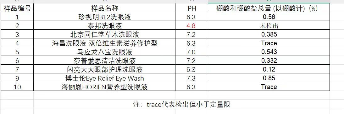 然而,知名测评博主“老爸评测”近日发布了一则视频称,其抽检的10款在售洗眼液中,竟有9款含有硼砂成分,而这些产品的成分表中却均未标明。