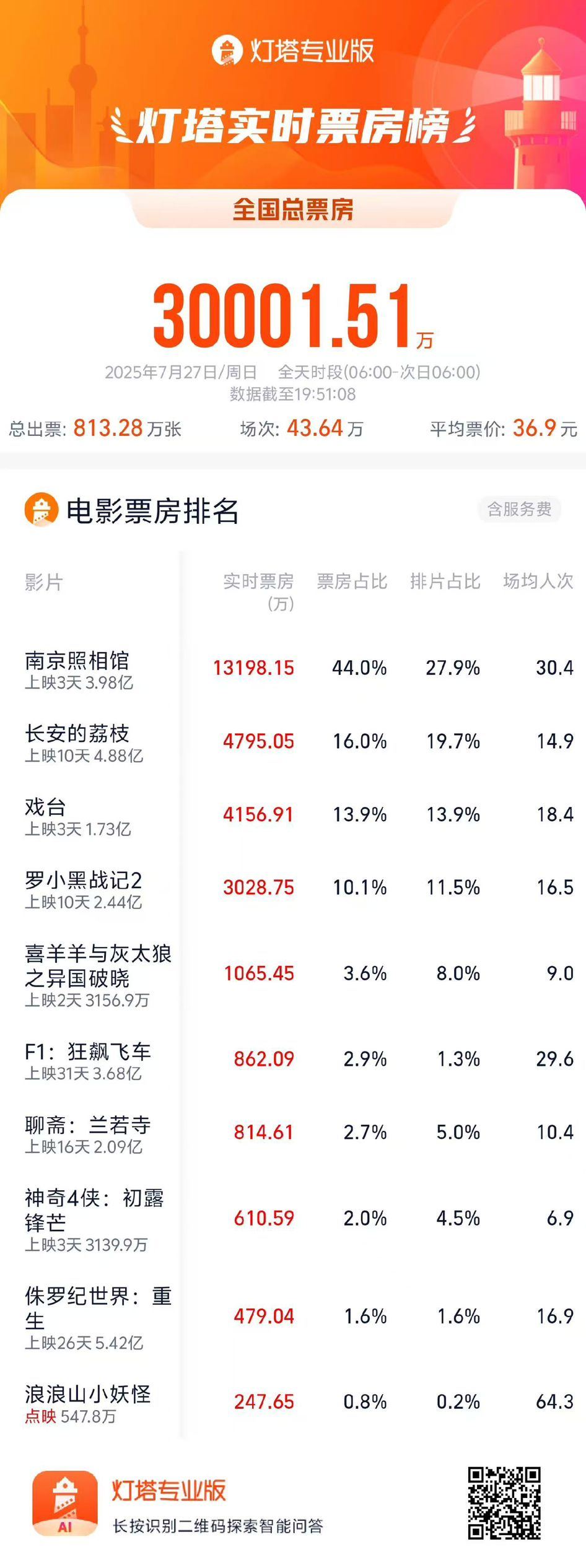 据灯塔专业版,截至7月27日19时51分,全国单日大盘票房突破3亿,这也是自今年2月23日后,时隔153天单日大盘票房再次破3亿!其中《南京照相馆》以1.31亿领跑。