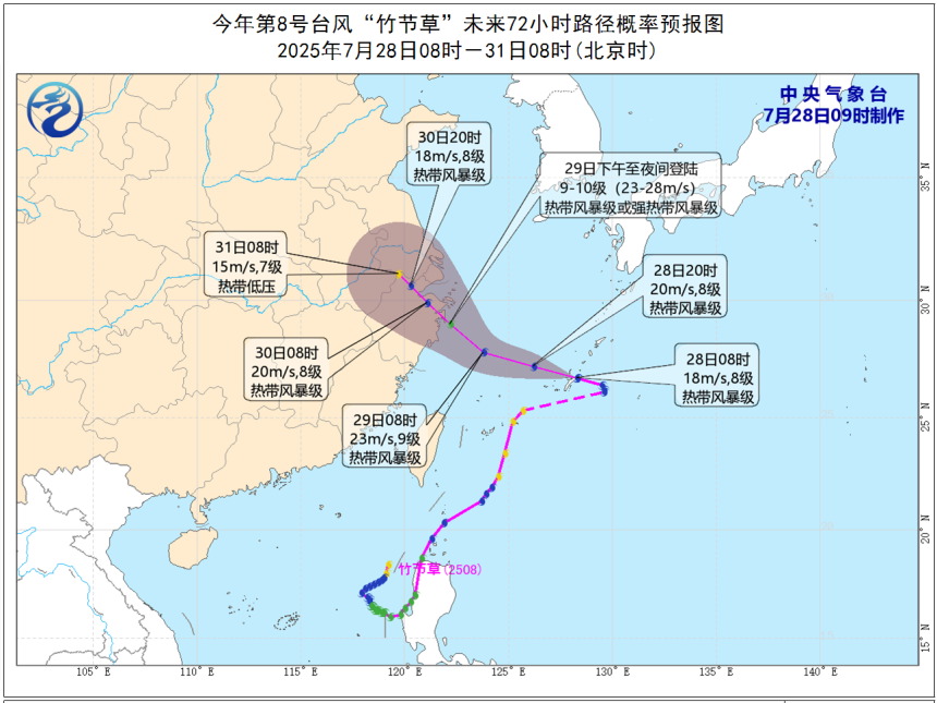 预计“竹节草”将以每小时15公里左右的速度向西北方向移动,强度逐渐增强;将于明天(30日)白天在象山到江苏启东一带沿海登陆(23~25米/秒,9~10级,热带风暴级或强热带风暴级),也不排除紧擦或穿过舟山群岛北上。