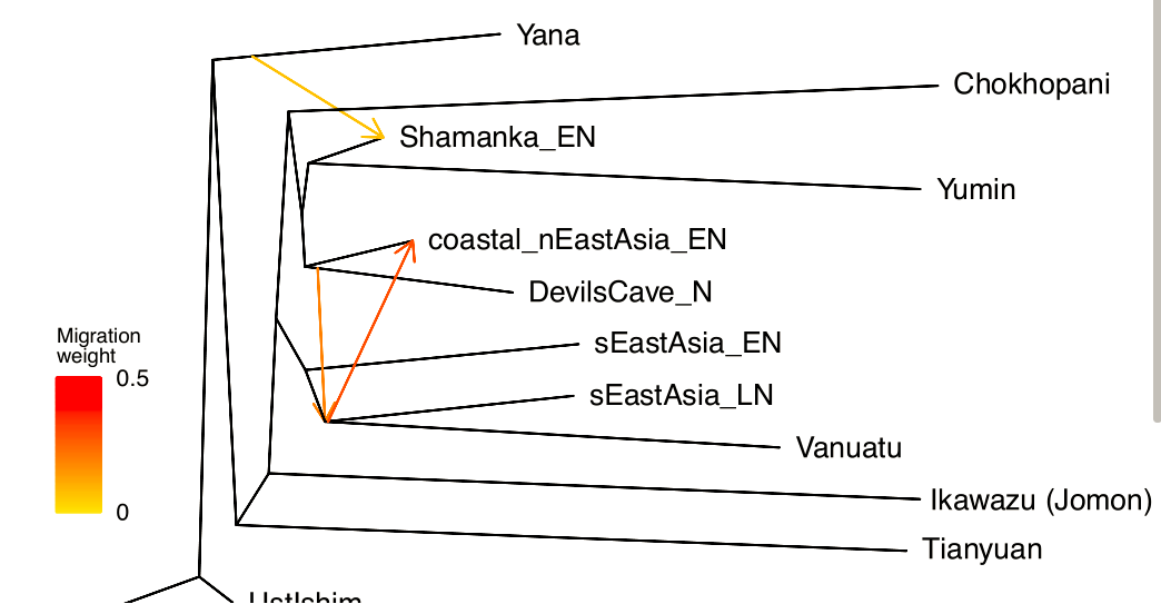 △ 三个迁移事件的最大似然系统发育图,箭头代表迁徙方向