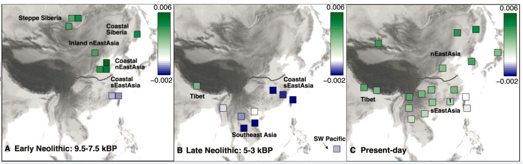 研究表明,随着时间的推移,东亚大陆南北方人群之间的差异性和分化程度逐渐缩小,这种变化暗示着自新石器时代以来南北方之间频繁的人群迁移与混合。有意思的是,在这个过程中,古北方人群成分对现在的东亚人显示出更多的影响。