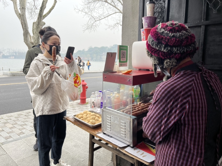 烤肠、麻糍、矿泉水、泡面……陈阿姨小店位于北山街街边,在自家的一楼,主要卖这些小吃,也正是这些小吃卖的最好。在买卖中,陈阿姨了解到,周六的游客,大多数来自杭州周边城市,而周日相对来说,游客就少了一些,“春天转眼就到了,人会越来越多的,但这是个苏醒的过程。”
