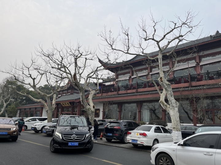 2月19日,楼外楼饭店外停满车辆。记者 贾晓雯 摄