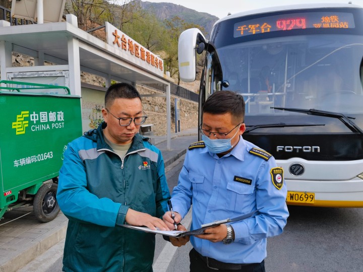 中国邮政北京市门头沟区分公司的工作人员与北京公交929路的驾驶员签署交接单