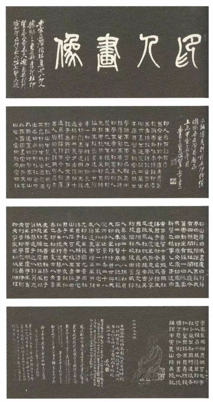 首任社长吴昌硕题文:印人画像——吾宗石潜同社集二十八印人像勒之贞石,嵌奉印社仰贤亭,以垂永久。灿光芒于列宿,切仰止於高山,彼七贤六逸,不能嫥美于前矣。印灯续焰,微吾石潜曷属焉。上元甲寅嘉平月,安吉吴昌硕,时年七十有二。大意是说:西泠印社创始人吴隐同社友收集了二十八位印人的画像,刻成石碑,镶嵌在仰贤亭的两壁,希望得以永久的供奉,印学能发扬光大,继往开来,印灯世代传承。