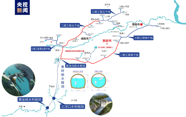 本次通水从引汉济渭年供水能力5亿立方米的三河口水库取水,经过秦岭输水隧洞,自流12个小时进入黄池沟配水枢纽。通过黑河供水连通洞进入黑河金盆水库西安供水管线,实现引汉济渭工程向西安正式供水,标志着引汉济渭工程取得重大关键性进展。