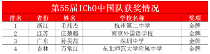 7月24日晚,在瑞士举行的第55届国际化学奥林匹克竞赛(IChO)传来好消息,中国队4名同学全部获得金牌。