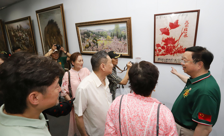 2023年7月23日,北京,志愿军第二任司令员兼政治委员邓华之子、志愿军研究会会长邓穗在展览现场向观众介绍在上甘岭战役中牺牲的志愿军烈士陈希誏的遗作《花前蝶双飞》。据CFP。