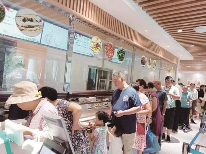 走进窗明几净的食堂,已有不少提前赶来吃饭的居民,有老年人,有一家三口为主,也有放暑假的大学生。