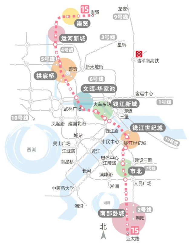 15号线是杭州地铁线网中南北向的穿心骨干线,以钱江新城、钱江世纪城为中心,向南连通萧山老城、临浦组团,向北辐射大城北、临平崇贤方向,实现城市南北两翼的便捷联系,支撑杭州多组团多中心的空间结构构建。