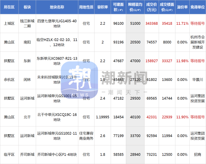至此,8宗涉宅地全部成功出让,杭州土拍单日吸金91.6亿。
