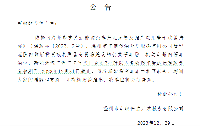 记者查询发现,近日,鹿城区、龙湾区、瓯海区、乐清市、永嘉县、龙港市等地相继发布调整新能源汽车停车优惠政策的通知,公告中再度重申“2小时”停车优惠到2023年12月31日截止。