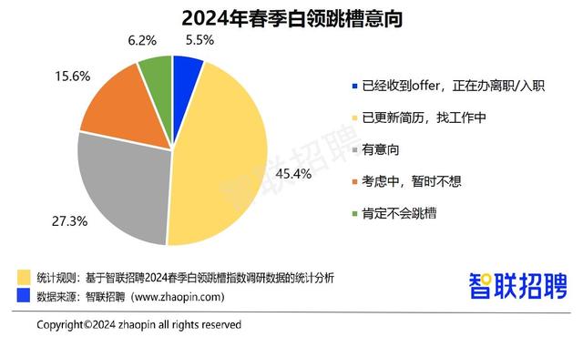 报告显示,2024年春招有跳槽意愿或行为的白领近八成。其中,45.4%白领“已更新简历,找工作中”,低于去年63.3%。27.3%白领“有意向”跳槽,低于去年29.1%。也有5.5%白领“已经收到offer,正在办离职/入职”,高于去年3.5%。