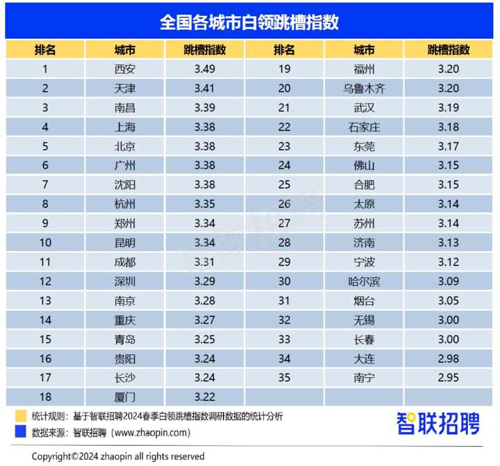 智联招聘调研数据显示,2024年春招季,杭州白领跳槽指数3.35,高于全国3.29的平均水平,排名第8。
