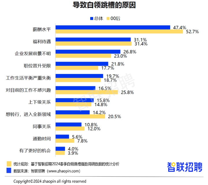 薪酬水平仍是白领跳槽首要因素,00后跳槽更关注自身兴趣